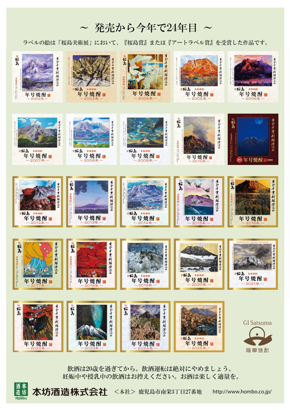 また、弊社の桜島年号焼酎は毎年アートラベルを採用させていただいております。今年のラベルデザインは、2025年2月に開催された「第26回桜島美術展」の桜島アートラベル賞受賞の村山 義明様の作品です。毎年かわるラベルデザインもあわせてお楽しみください。