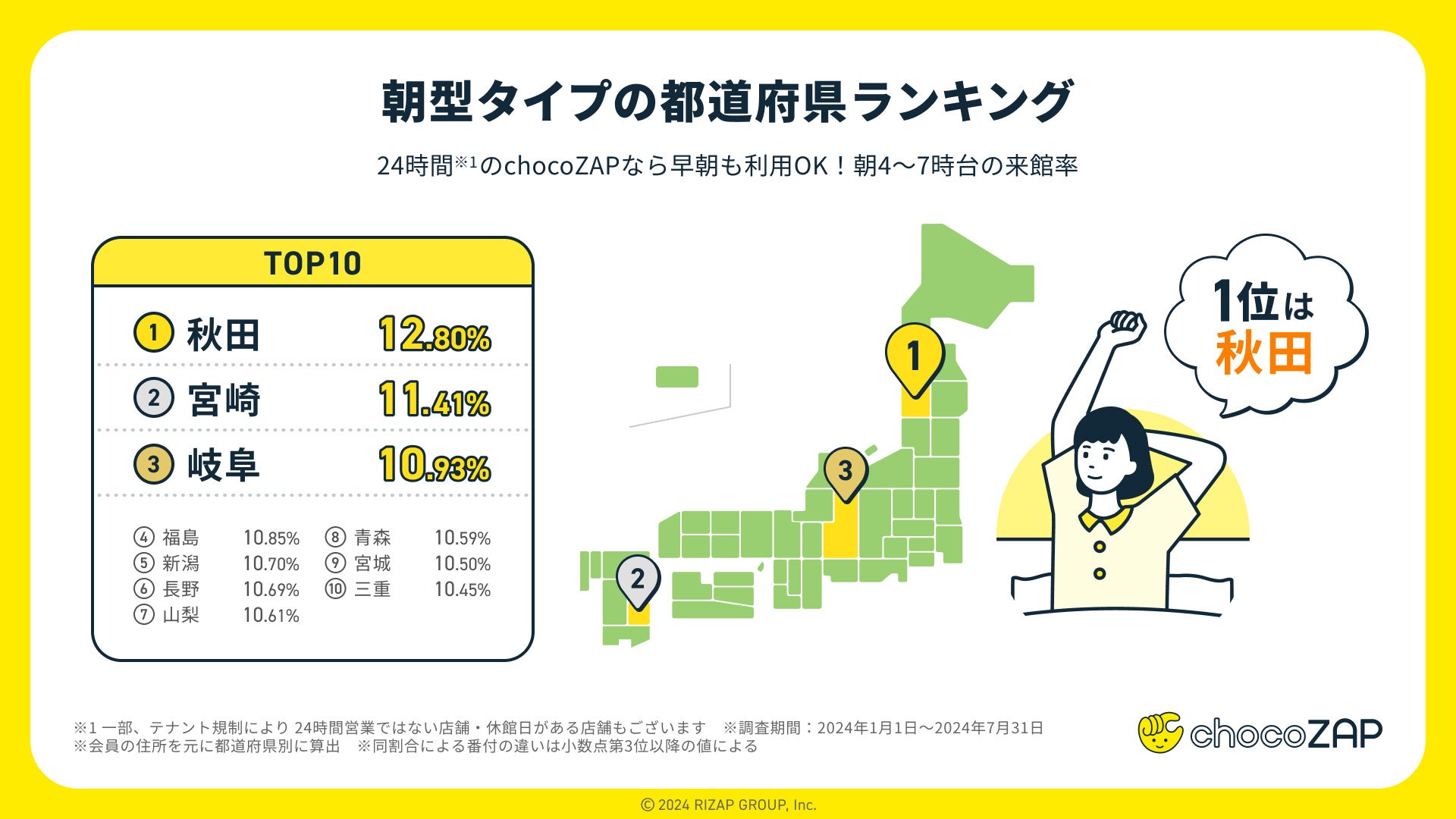 chocoZAPはトレーナーが常駐してない無人スタイルのフィットネスジムですが、会員様にchocoZAPサービスをご利用いただくにあたっては、アプリ等を通じて必要な情報をしっかりお届けできるよう、データを活用したサービス設計をしています。スターターキットとして会員様へ提供している体組成計・ヘルスウォッチ・アプリの情報についても、会員様ご自身での健康管理にお役立ていただくとともに、chocoZAPにおいても重要な情報資産として捉えております。この度の発表は、そうしたデータの一部を47都道府県ランキング形式に加工したものです。今後も統計処理したデータ発表を継続的に行ってまいります。