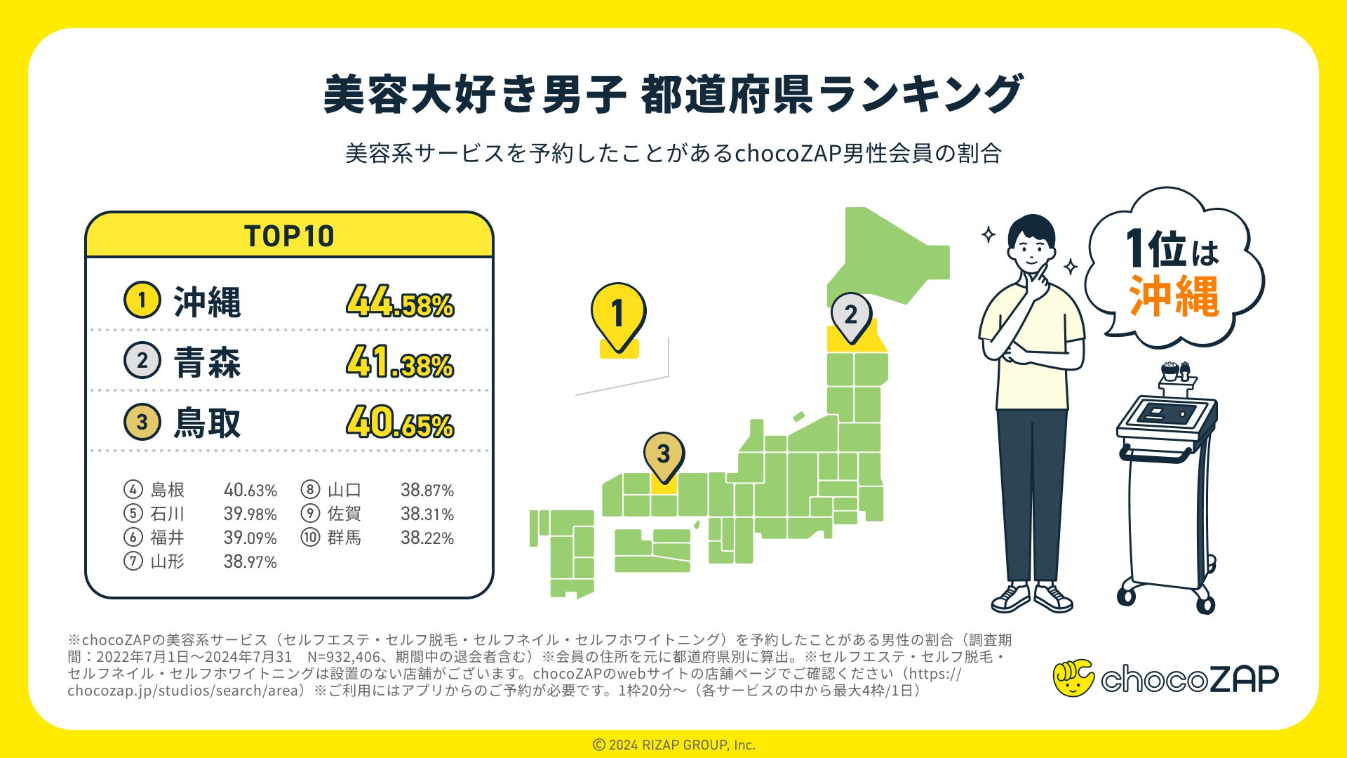 沖縄県民は「おおらかでマイペース。人とのつながりを大切にする」性格です。南国の強い日差しの下で生活しており、肌ケアへの関心が高いようです。リゾート地として観光客が多く、見た目を重視する文化が根付いていることから、chocoZAPの美容サービスを積極的に利用し、自分磨きに励んでいる可能性があります。