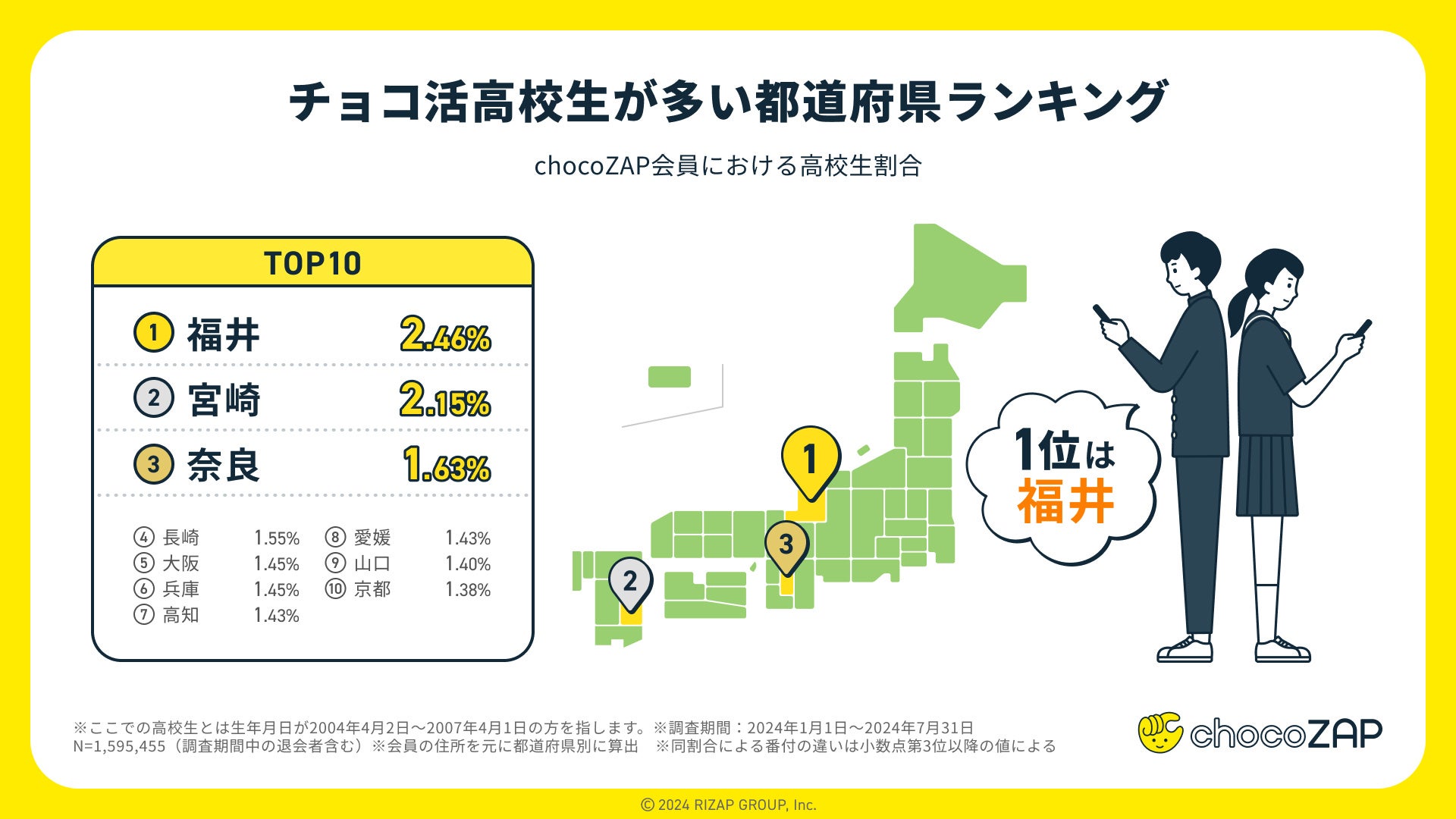 都道府県ごとの、全chocoZAP会員における高校生の割合ランキングです。ここでの高校生とは生年月日が2004年4月2日〜2007年4月1日の方を指します。調査期間:2024年1月1日~2024年7月31日 N=1,595,455(調査期間中の退会者含む)なお、chocoZAPでは、15歳以上~90歳未満の方がご利用いただけるルールになっています。