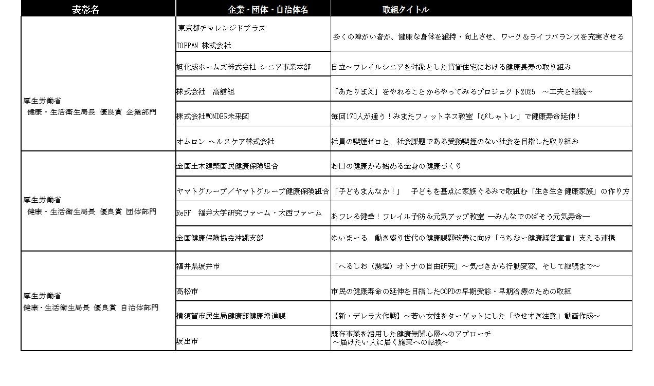 厚生労働省及びスポーツ庁は、令和7年11月26日(水)、日経ホール(東京都千代田区)にて、「第14回 健康寿命をのばそう!アワード」(介護予防・高齢者生活支援分野/生活習慣病予防分野)の最終審査・表彰式を開催いたしました。本アワードは、生活習慣病の予防や介護予防など、国民の健康寿命延伸に資する優れた取組を行う企業・団体・自治体を顕彰するものです。全国から寄せられた応募の中から、各分野における最優秀賞・優秀賞・優良賞などが決定されました。