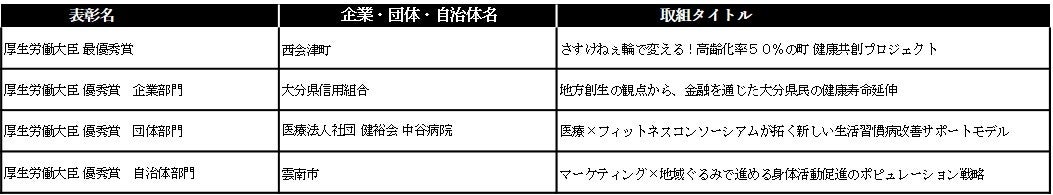 厚生労働大臣 最優秀賞は、西会津町の『さすけねぇ輪で変える!高齢化率50%の町 健康共創プロジェクト』が受賞されました。厚生労働大臣 優秀賞には、企業部門から大分県信用組合、団体部門から医療法人社団 健裕会 中谷病院、自治体部門から雲南市が選ばれました。また、特にスポーツ・運動を通じて優れた取組を行うスポーツ庁長官 優秀賞には、企業部門でグローバルシステムズ株式会社、団体部門で公益財団法人日本ゴルフ協会、自治体部門で山形県上山市が受賞されました。