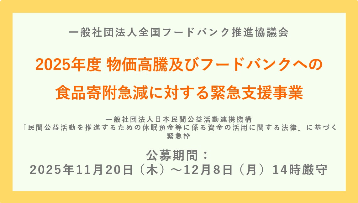 つきましては、2025年度休眠預金事業「物価高騰及びフードバンクへの食品寄附急減に対する緊急支援事業」の実行団体を公募いたします。