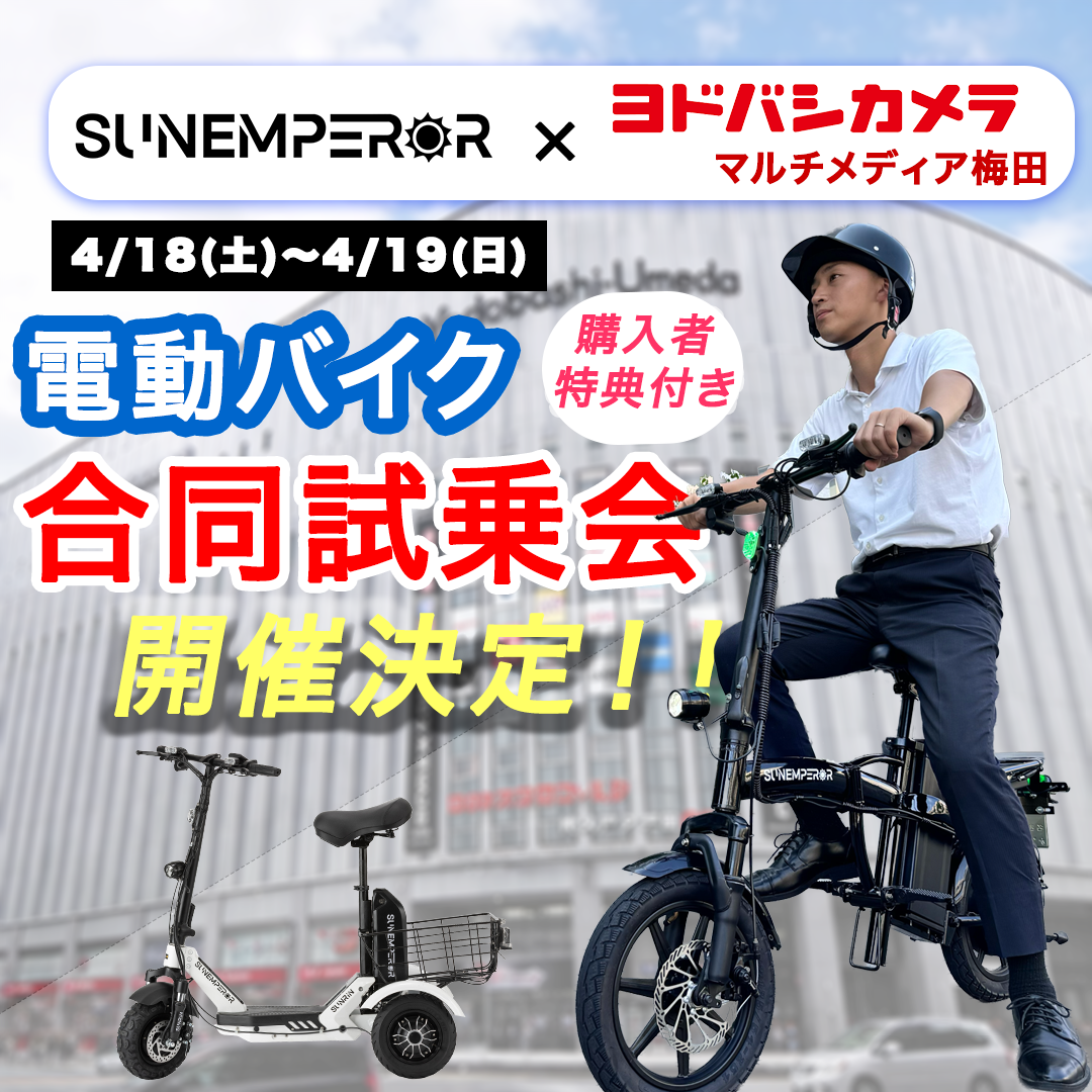 電動モビリティブランド「Sun Emperor(サンエンペラー)」を展開する有限会社 龍昇(本社:愛知県名古屋市)は、2026年4月18日(土)・19日(日)の2日間、ヨドバシカメラ マルチメディア梅田店にて、合同試乗会を開催いたします。