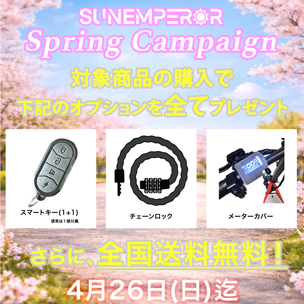 現在Sun Emperorでは、2026年4月26日(日)までの期間、特定小型原付「SS1」・特定小型原付「Easy」・特定小型原付「SUNRIN」をご購入のお客様に、下記のオプションパーツをプレゼントいたします。