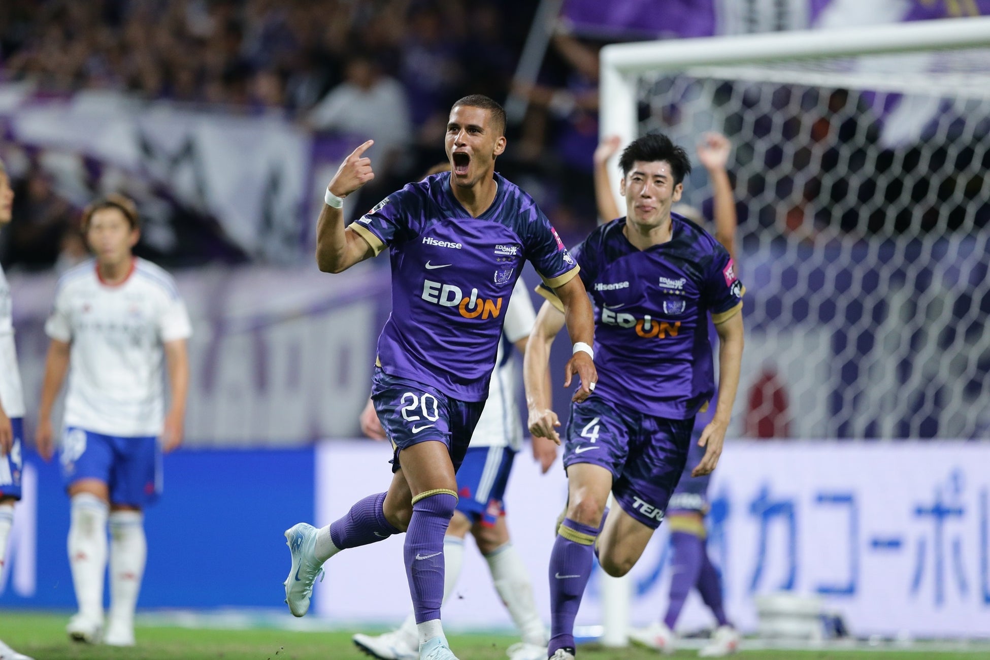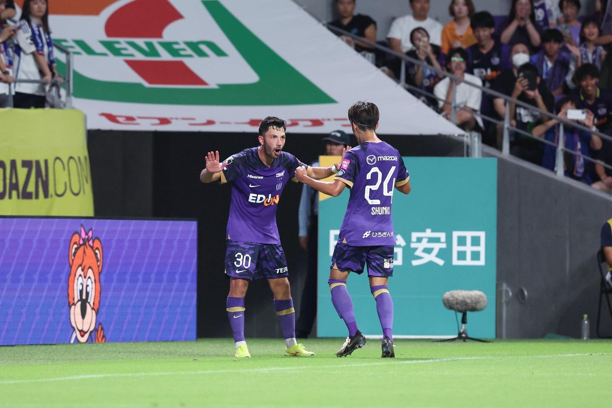 前半3分、加藤陸次樹選手が電光石火のゴールで先制。19分に同点に追いつかれるも、“紫の魔法使い”トルガイ・アルスラン選手が2ゴールをあげます。前半を3-2で折り返し、多くのゴールが生まれた前半にスタジアムの熱気が高まります。