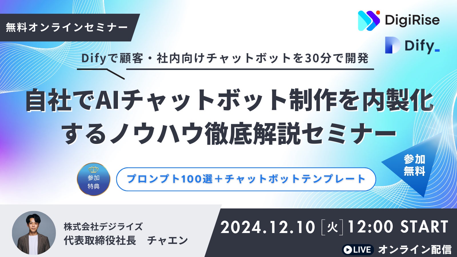 「AIの利便性と感動を全ての人に届ける」をビジョンに掲げる株式会社デジライズ(本社:東京都港区、代表取締役CEO:茶圓 将裕)は、2024年12月10日12時より、『【AI開発最前線】30分でチャットボット完成!Difyで実現する業務革新セミナ』を無料開催いたします。