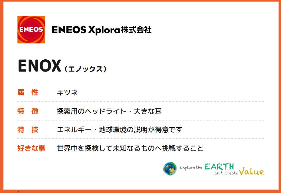 ENOXは、ENEOSブランドカラーの1つである赤をベースとし、探索用のヘッドライトと情報を聞き逃さない大きな耳を持つことを特徴とする、賢く、ユーモアにあふれたキツネです。当社の理念“Explore the EARTH and Create Value”を体現し、世界中を探検して未知なるものへの挑戦をしながら、活躍してまいります。『ENOX』の応援を、よろしくお願いいたします!