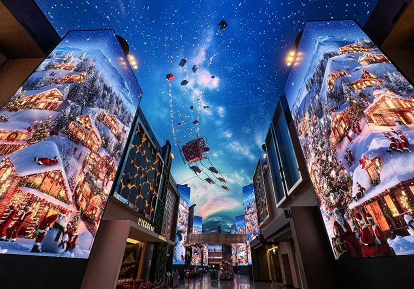 12月は期間限定で「サンタクロース村」がテーマです。今にもトナカイがソリを引いて空から舞い降りてきそうな、童話のような雪国の村が映し出されます。クリスマス仕様で飾られた家や大きな木々、たくさんのサンタがクリスマスの準備をして村中を駆け回っている風景をお楽しみいただけるコンテンツとなっています。シーンの終盤に近づくと、年長のサンタが全長150メートルのオーロラ全体を金色のソリで走り抜け、プレゼントを落とすなど、ドラマチックでエキサイティングな展開が見る人を惹き付ける内容となっています。