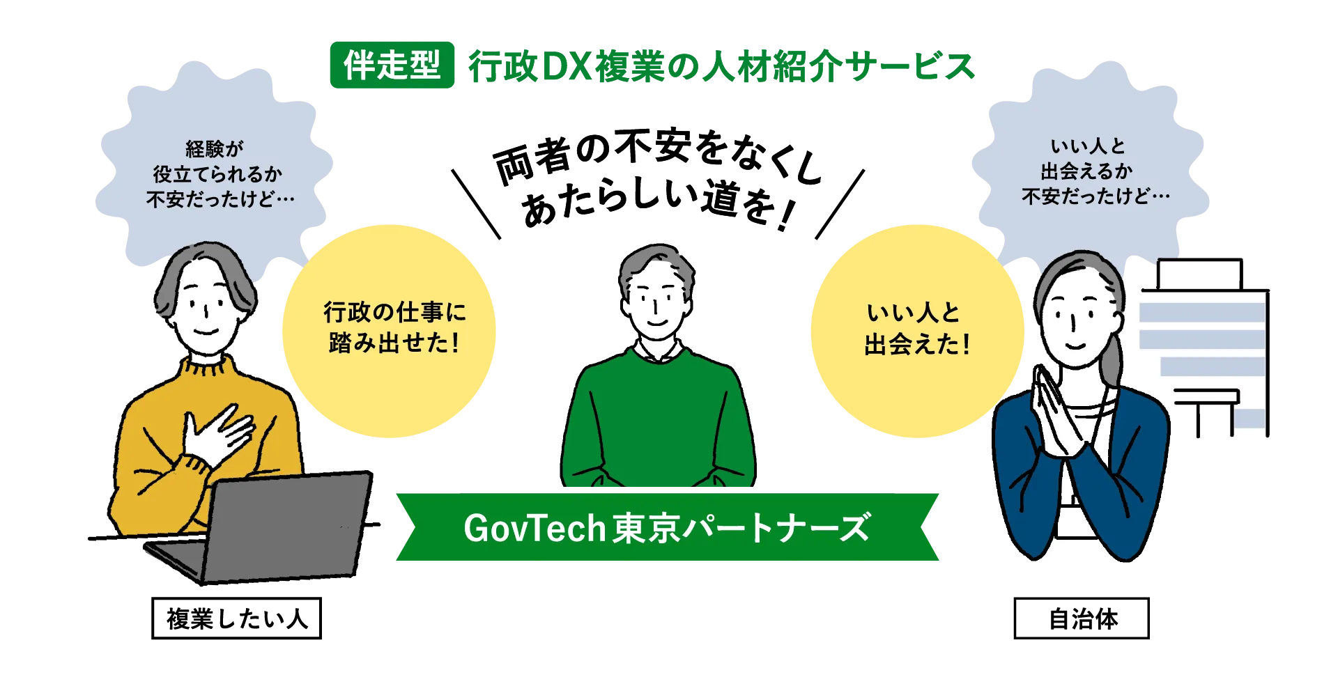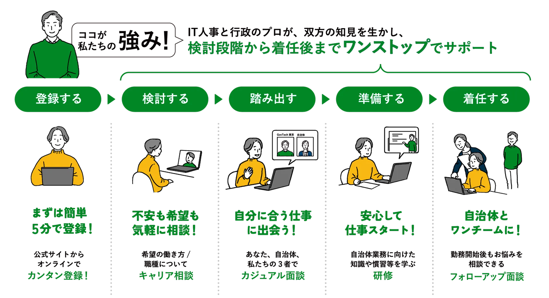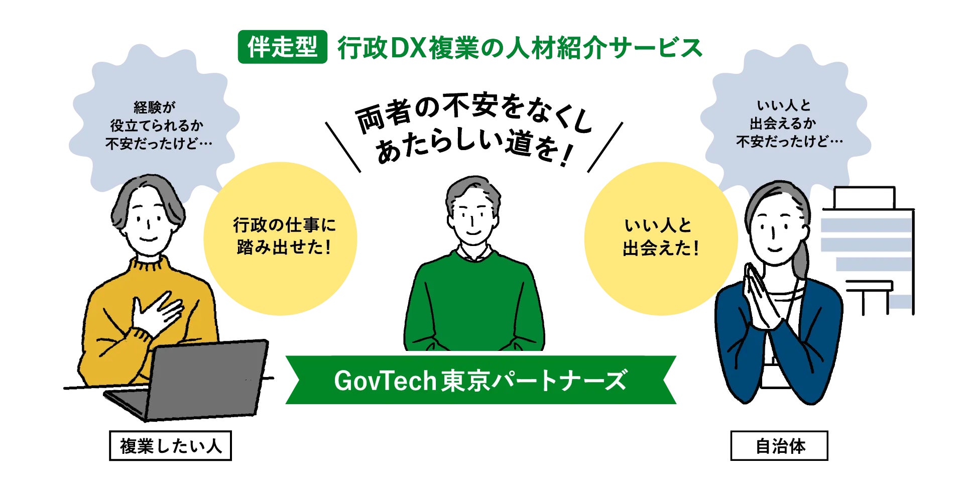 本サービスは、自治体の課題解決を支援すると同時に、働く人のやりがいの実現も叶えるためのワンストップサポート体制にあります。
