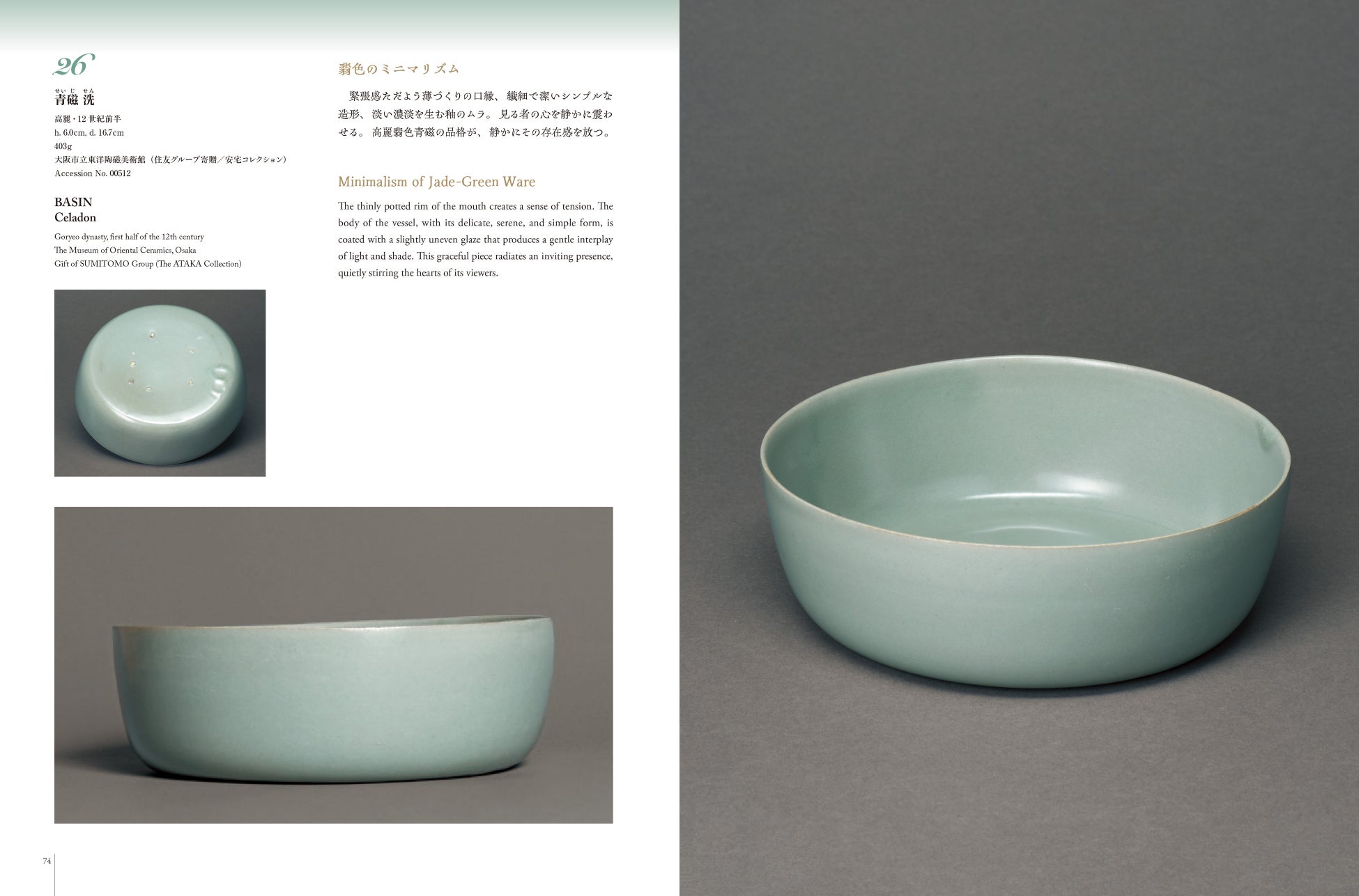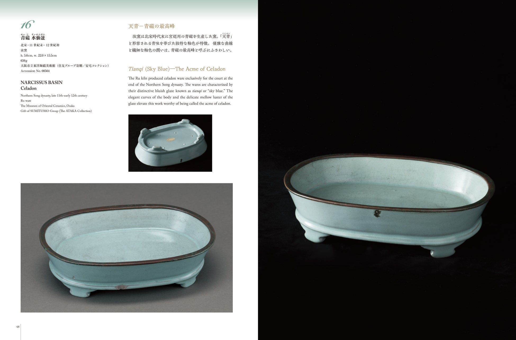 青磁の最高峰は、北宋時代末に宮廷用の青磁を焼成した窯、汝窯でつくられた汝窯青磁といわれています。現存する数の少なさとその格調高い美しさから、世界中の愛好家を魅了し続けています。汝窯青磁は「天青(てんせい)」と呼ばれる、青みを帯びた淡い釉色が特徴です。本書では、日本にある数少ない汝窯青磁である《青磁 水仙盆》をご紹介します。釉色とともにその優雅な曲線にも目を奪われます。歴代の皇帝たちが愛した汝窯青磁の最高峰をじっくりとご覧ください。
