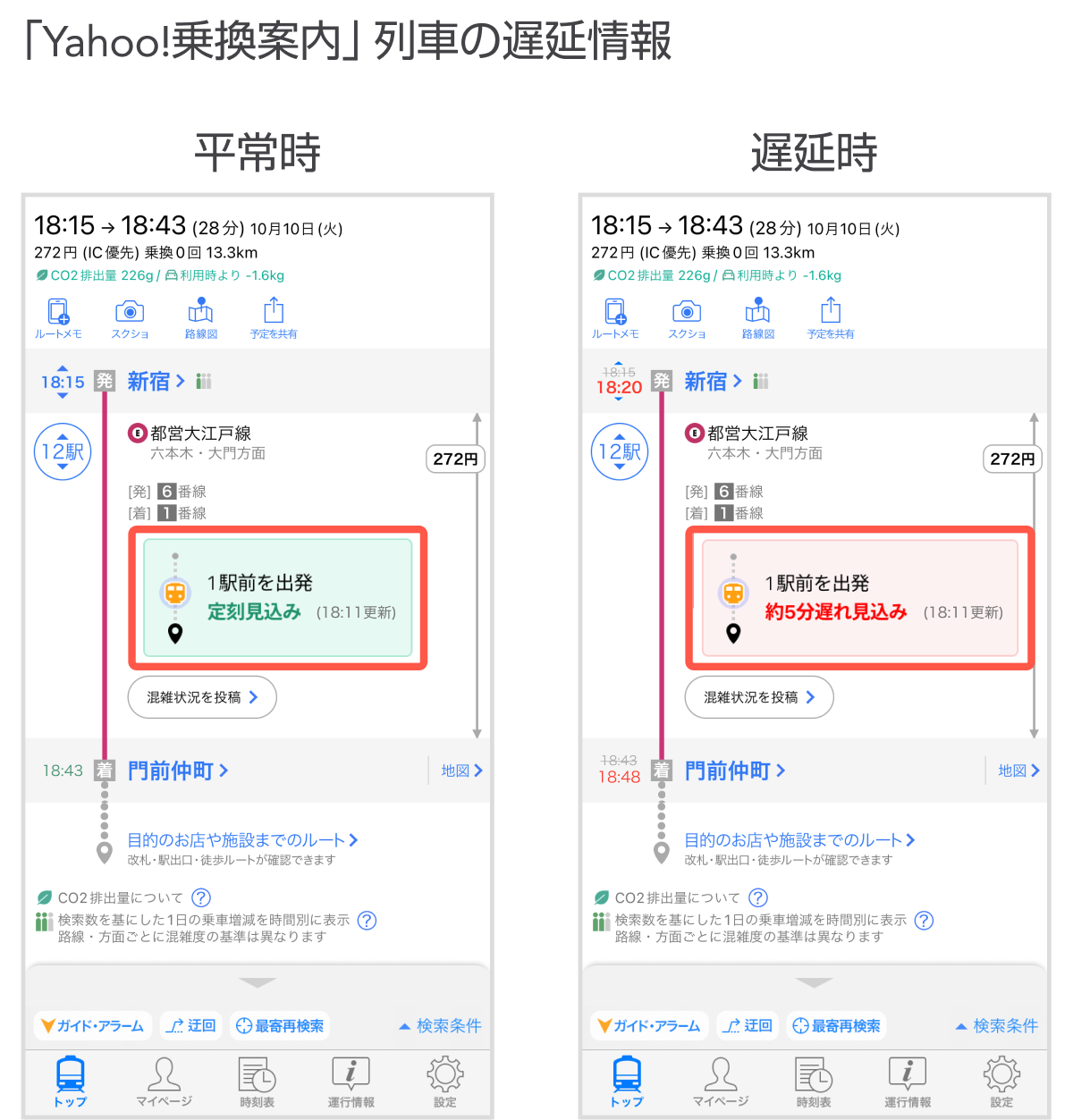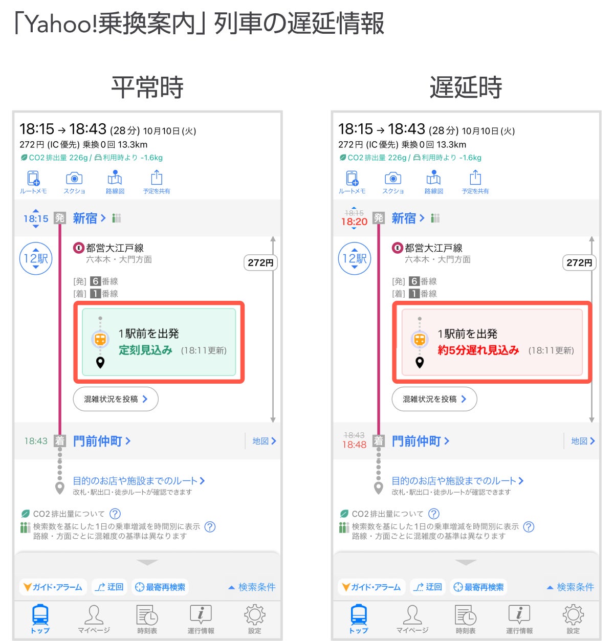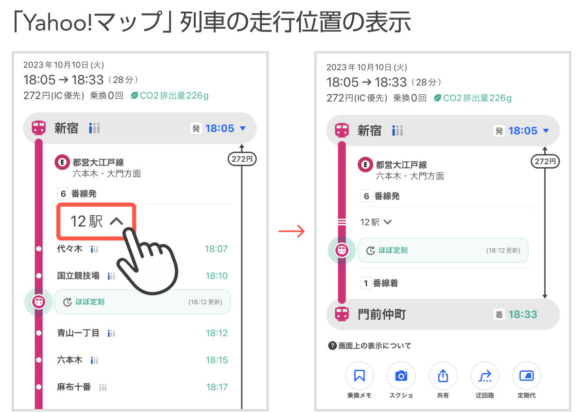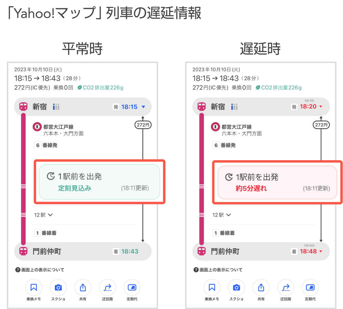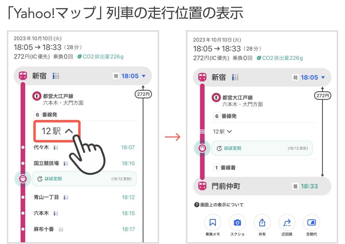 「Yahoo!乗換案内」「Yahoo!マップ」はこれまで、2023年2月にJR東日本や小田急電鉄の一部の在来線(※1)、2023年8月に東京メトロ(※2)のリアルタイムな接近情報や遅延情報などをルート検索結果画面に表示する機能を提供しております。