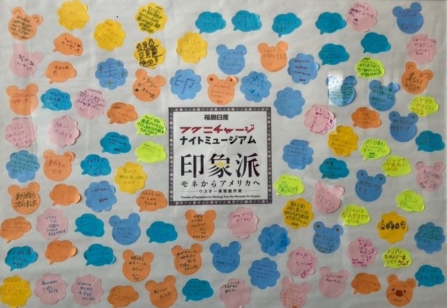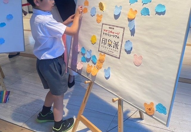 本企画ならではの特別対応として、親子で会話をしながら・絵画の前でデッサンをしながら鑑賞することができました。会場内ではスケッチブックを片手に熱心に絵を描く子どもの様子や、親子や子どもたち同士で絵の感想を語らいながら名画を楽しんでいる様子がみられました。鑑賞後に子どもたちは思い思いにメッセージを書き出し、ボードに添付していました。