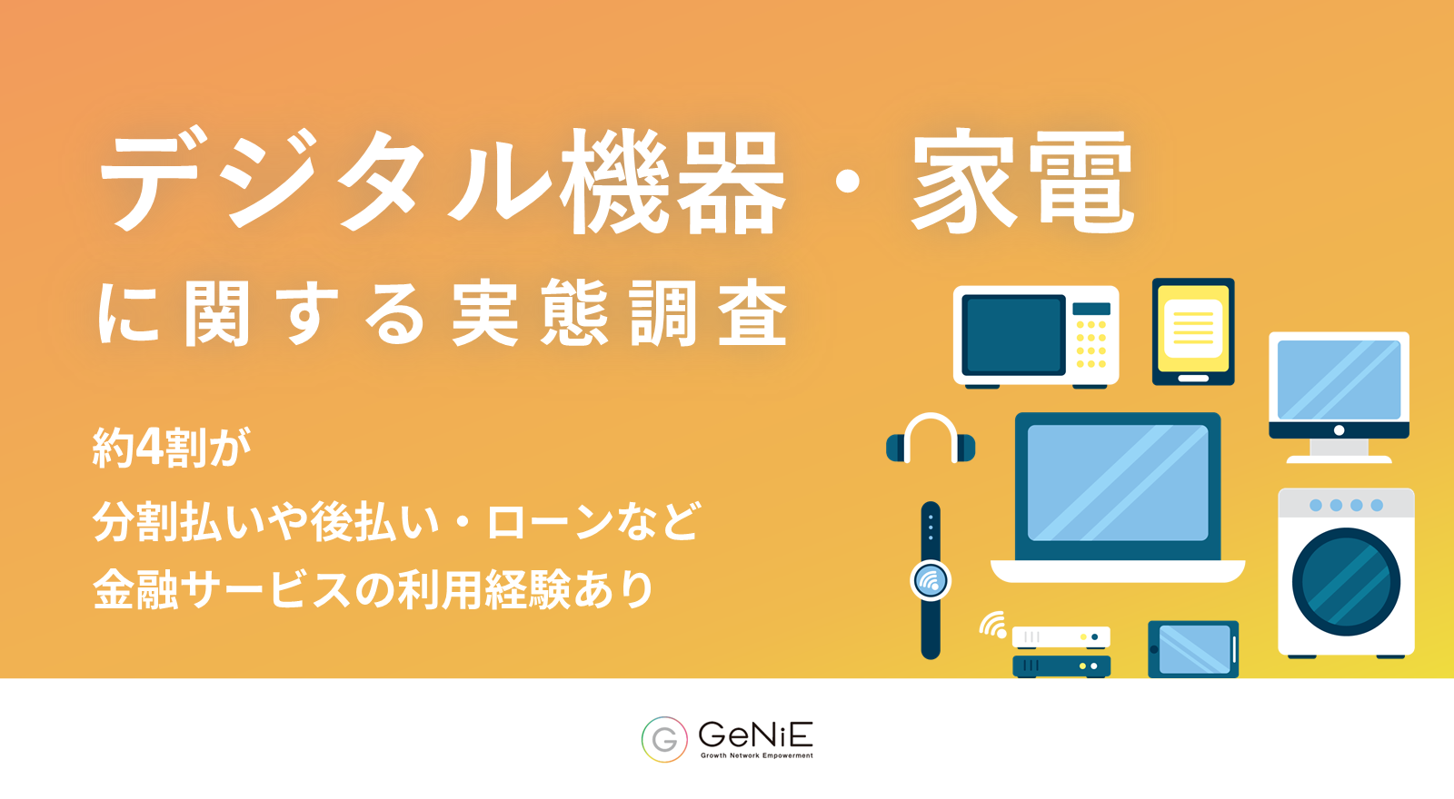 エンベデッド・ファイナンスを展開するGeNiE株式会社(本社:東京都中央区、代表取締役社長:齊藤雄一郎)は、全国の20歳〜69歳の男女を対象に「デジタル機器・家電の購入と分割払いに関する実態調査」を実施しました。