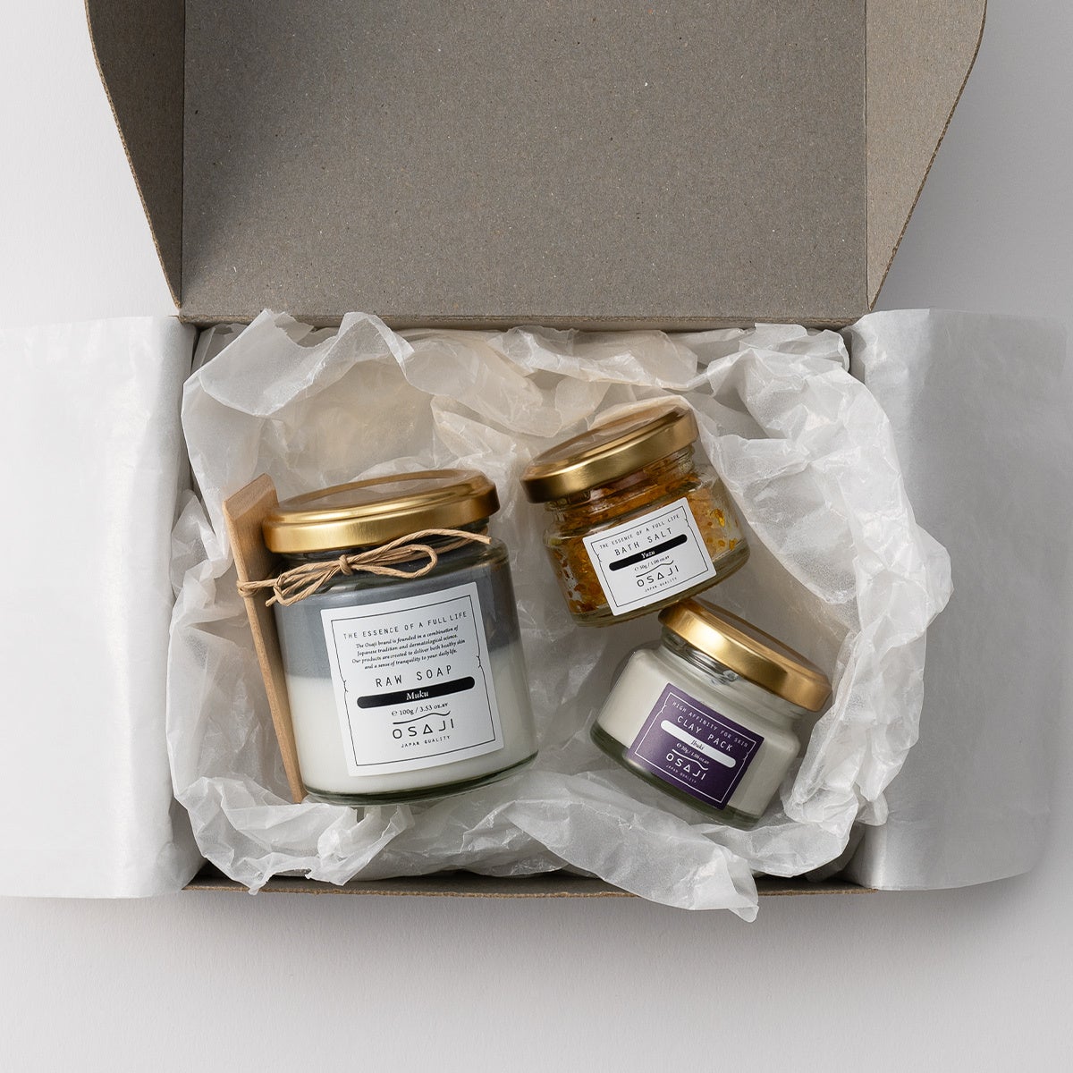 うるおい成分が溶け込んだ半練り状の洗顔石けんと、バスソルト、クレイパック ミニのギフトセット。