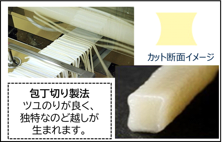 コシとのど越しが良い讃岐うどんです。「包丁切り」製法により麺の側面をくぼませることで、よりつゆ乗りに優れ、抜群ののど越しに仕上がっています。原材料には小麦粉、塩、水だけを使い、小麦本来の香りを感じていただけます。自社センターで独自に配合したつゆとともにお楽しみください。