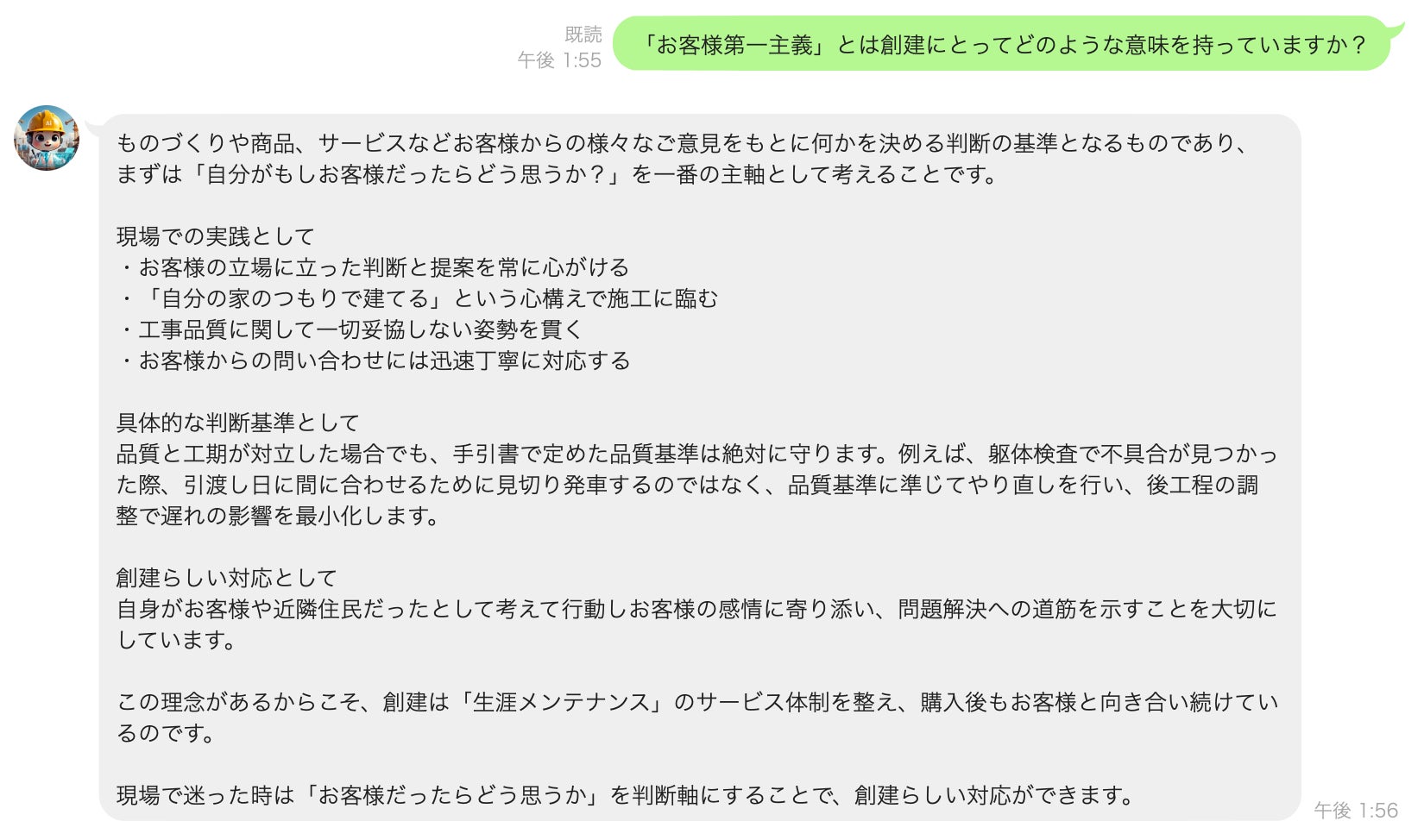 マニュアル徹底と即時回答:施工マニュアルや対応ルールをAIが理解し、LINEなどで瞬時に回答。