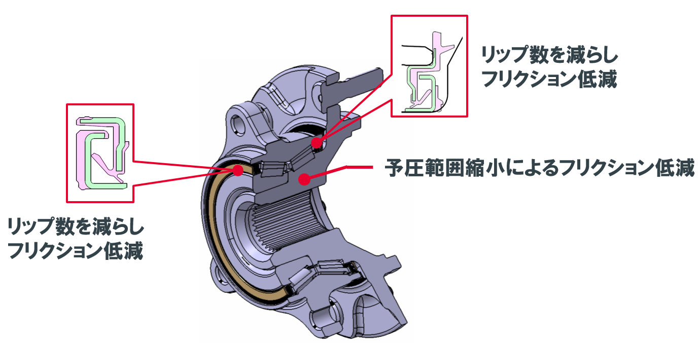 大型SUVやピックアップトラックなどの重量が重い車両カテゴリーでは、軸受の負荷容量が玉軸受よりも大きい、円すいころ軸受が採用されています。円すいころ軸受は玉軸受よりもフリクションが大きいため、フリクションの低減が求められています。また、これらの車両は、不整地・長距離など乗用車よりも過酷な環境で使用されることが多いため、シール性や耐久性などの信頼性も不可欠です。