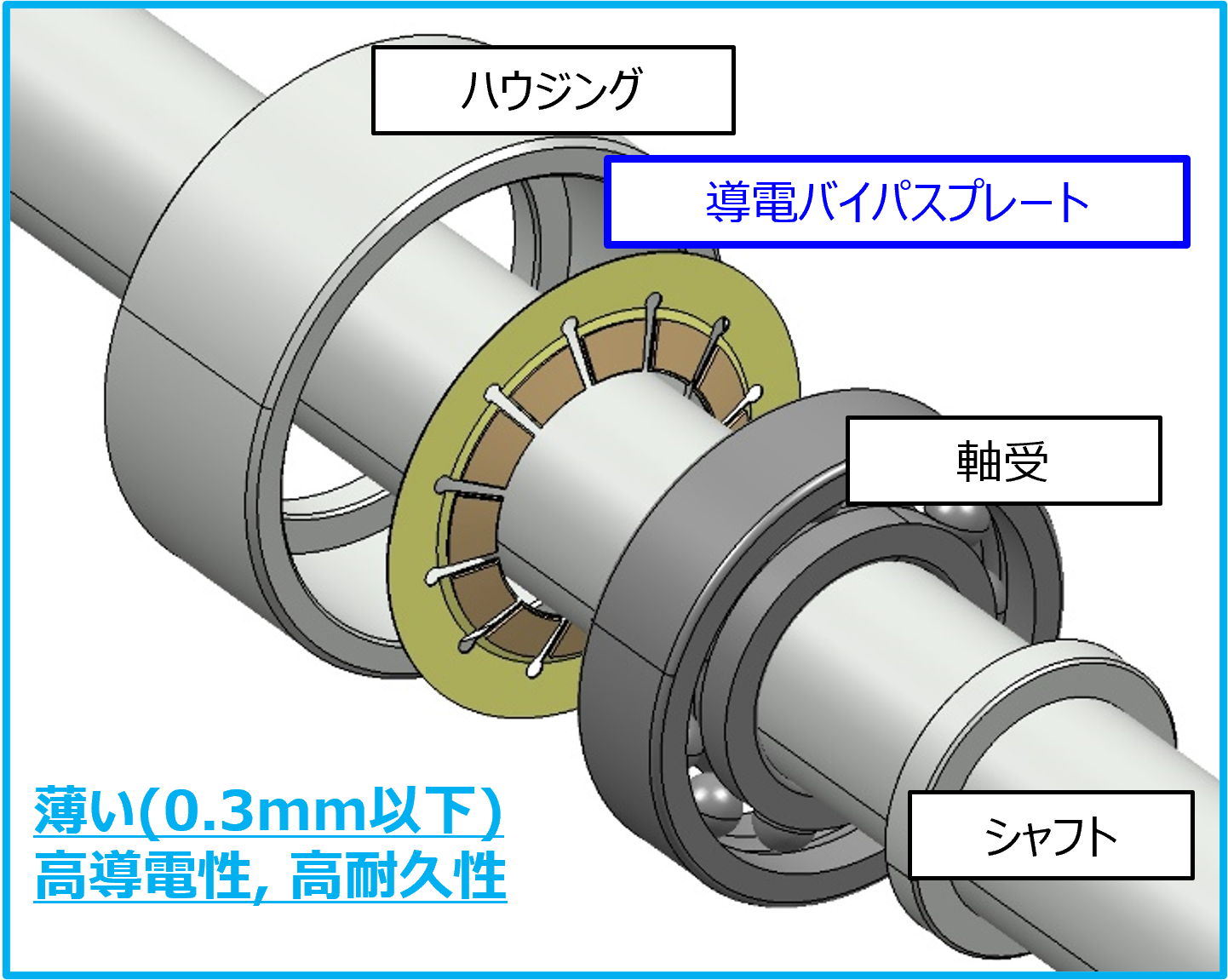 耐電食/EMC対策の導電アイテムは省スペース、導電性、耐久性が求められており、本製品はスプリング反力を活用した製品構造と独自開発した導電ペーパーを採用することにより、軸方向の追加スペース0.3mm以下で、軸受をバイパスする導電構造を実現しました。
