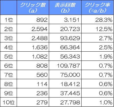 最上位に表示されるだけあって、検索画面上でユーザーの目に留まりやすく、4人に1人以上がクリックしている計算になります。ほかの順位と比較すると、CTRの高さは際立っています。