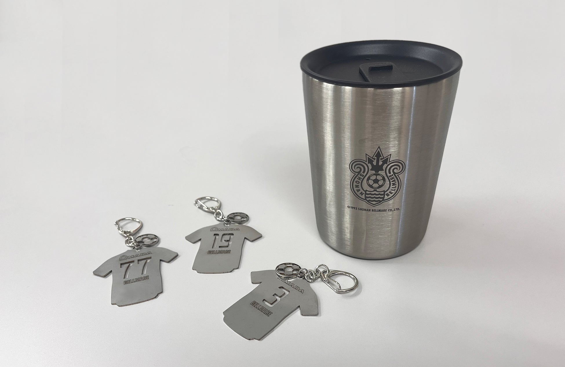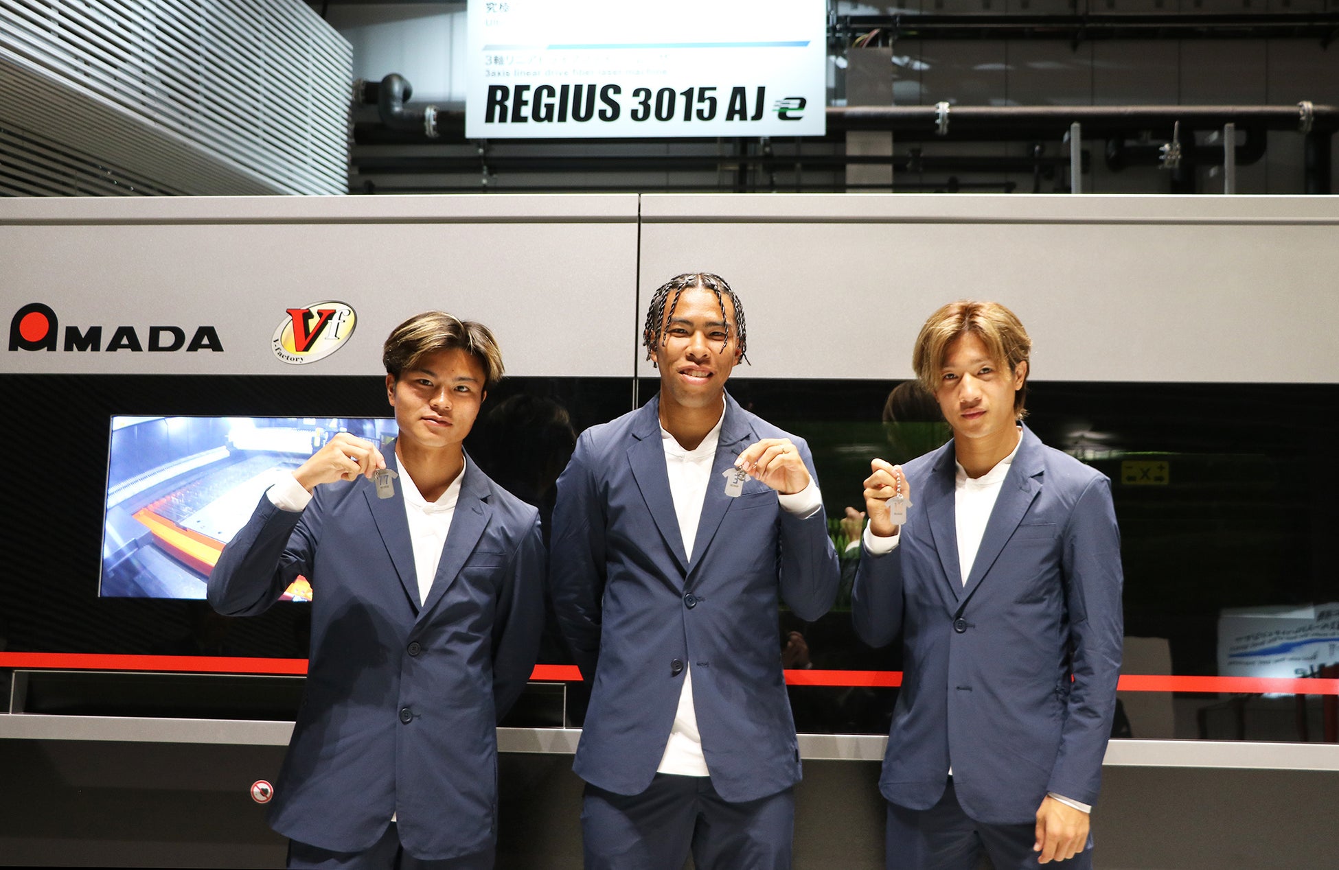 眞壁会長と3選手は歓談の後、本社内の展示施設にてアマダの主力商品である板金加工機が実際に金属を加工する様子を見学。その速度と精度に選手の皆さんからは感嘆の声が上がっていました。ご来場いただいた記念として、アマダで加工した湘南ベルマーレのエンブレム入りタンブラーとキーホルダーをプレゼントし、大変喜んでいただきました。