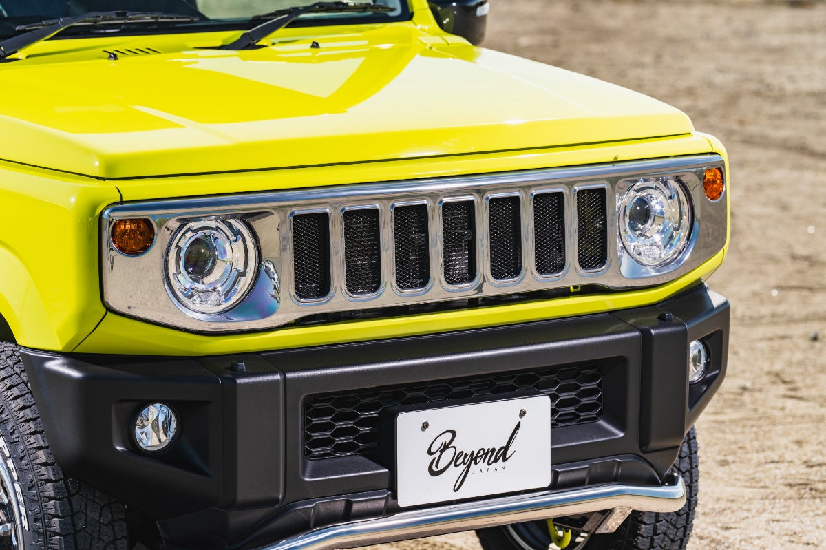 ステンレス素材を使用:質感の高さが際立つ鏡面仕上げで、ジムニーのフロントをより力強く演出。