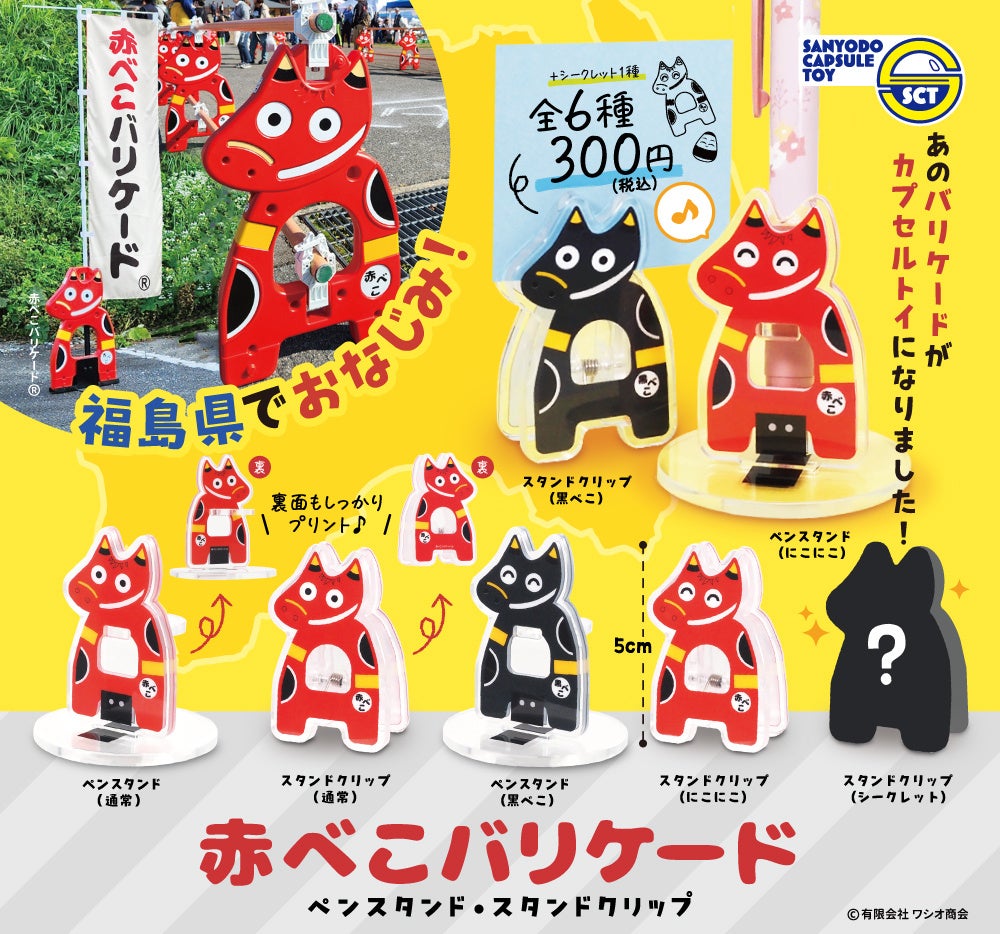 縁日商材をはじめとする玩具等の製造販売を行う株式会社三洋堂(本社:愛知県岩倉市、代表取締役:折小野 嘉輝)は、新商品『赤べこバリケード ペンスタンド・スタンドクリップ』全6種+シークレット1種を、2025年7月22日(火)より全国のカプセルトイ売り場で順次発売を開始いたします。