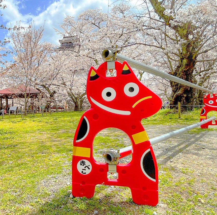 福島県の工事現場や駐車場、催事場、店先、はたまた一般家庭の軒先にも置かれている、SNSで話題になった大人気の『赤べこバリケード』。