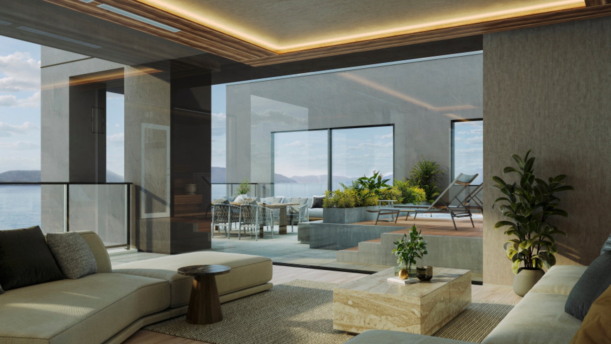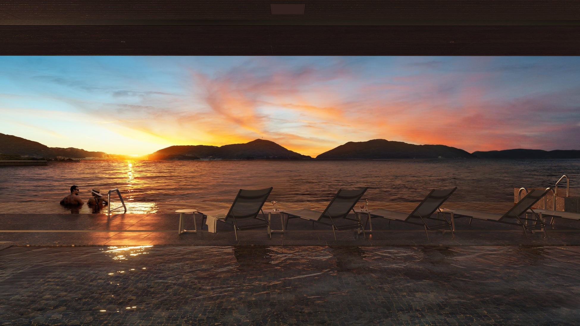 最⼤20名収容のサウナにはオートロウリュ機能を備え、深さ1.2mの⽔⾵呂や室内⾵呂、海と⼀体化するインフィニティプールも完備。