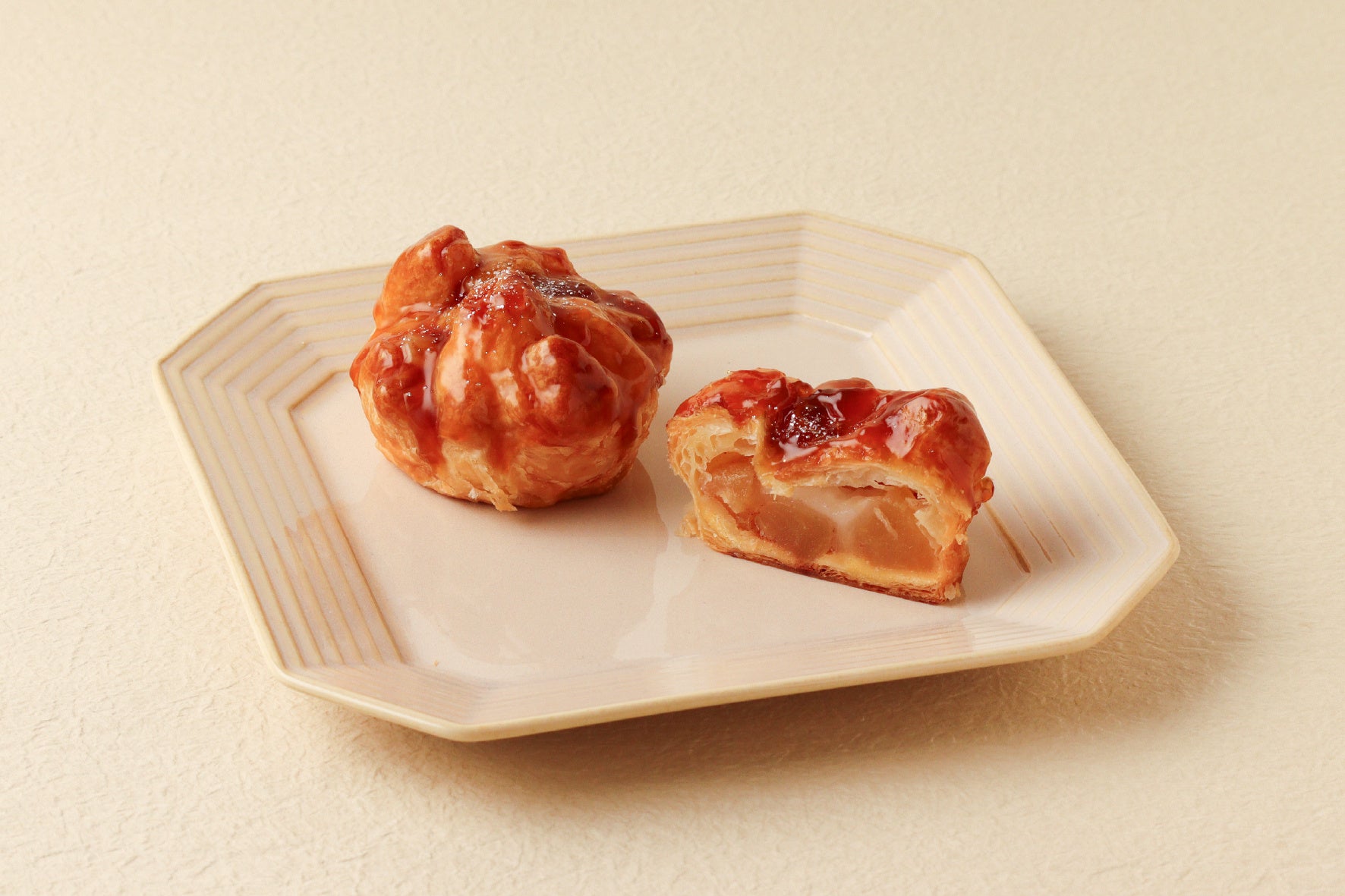バイカルの王道アップルパイに、ふんわりとしたお餅を忍ばせ焼き上げ、特製のみたらし餡をかけた、これまでにないアップルパイです。通常のホールのアップルパイと同じく、バターやアップルワイン、シナモン等とソテーしたりんごの優しい甘みとパイ生地のほのかな塩味。そしてみたらし餡の甘じょっぱさとふんわりと両者をつなぐお餅の食感が絶妙なハーモニーを織りなします。