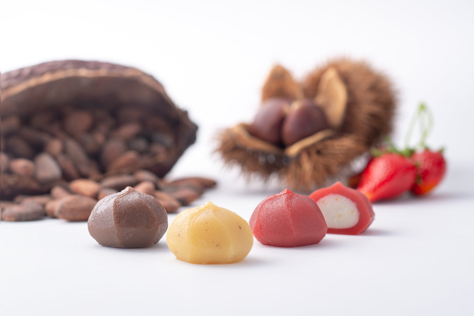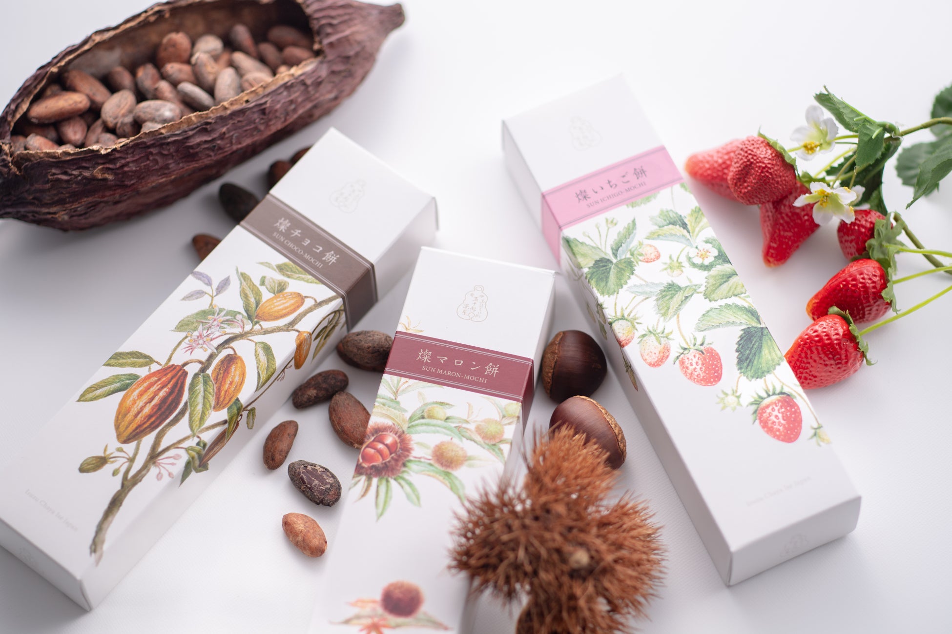 「燦マロン餅」「燦いちご餅」「燦チョコ餅」は、いちご・カカオ・栗といった太陽の光で育つ“太陽の実”に着目し、“あん”の奥深さを主役に据えたシリーズです。やわらかな餅と素材の持ち味をいかした“あん”をひと粒に閉じ込め、〈“あん”を味わう新しいかたち〉として仕立てました。手描きの線と色彩で太陽の恵みを表したパッケージは、世代や国を問わず手に取りやすい温もりを感じていただけるよう工夫しています。