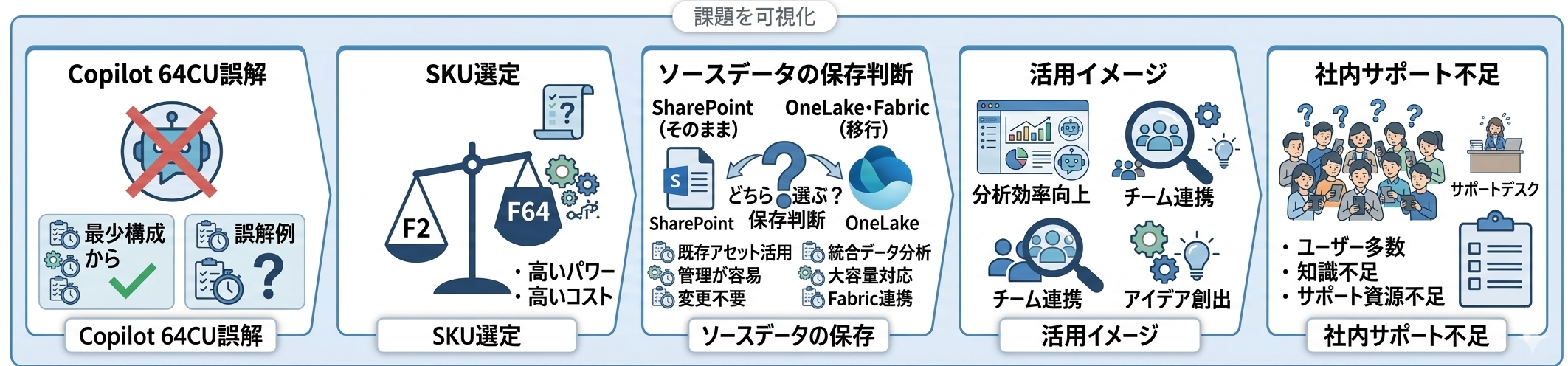 Microsoft Power BI Fabric は、データ分析・AI活用基盤として注目が高まる一方、導入検討段階にある企業からは、以下のような課題や疑問の声が多く寄せられています。