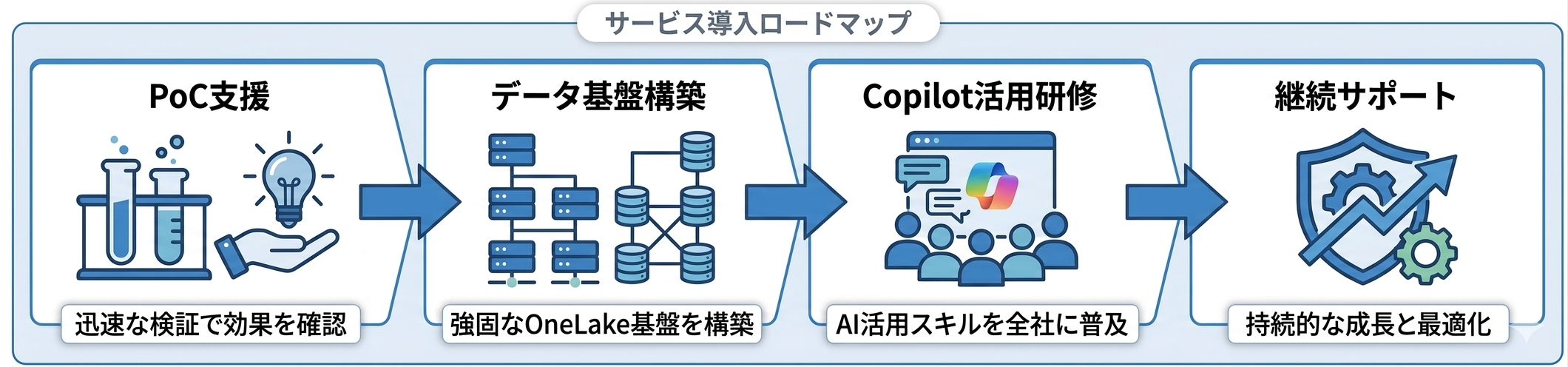 「Power BI Fabric 導入支援サービス」は、導入検討から運用定着まで、企業の段階に合わせて以下のメニューを提供します。