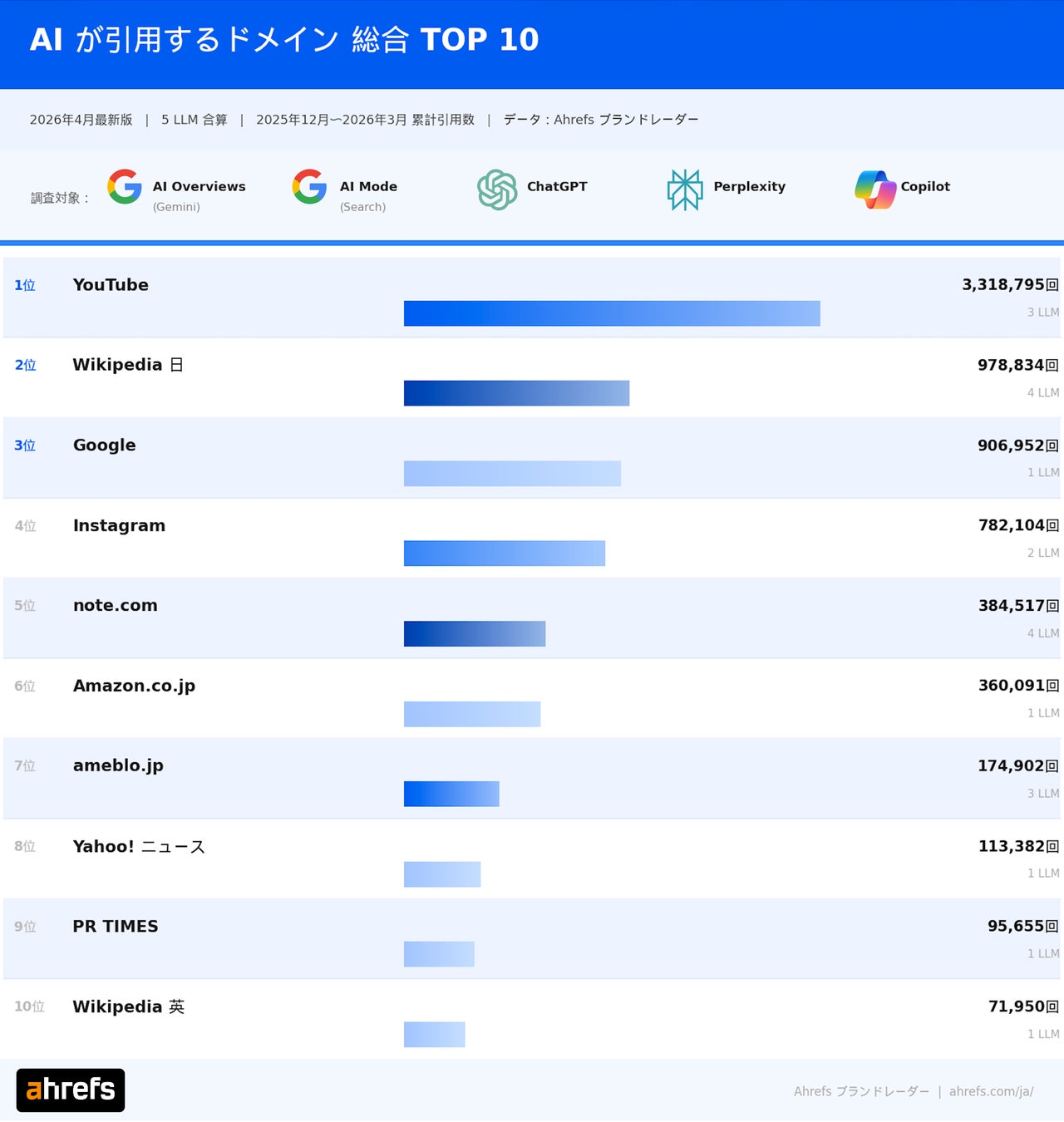 詳細のブログ記事:「AI が最も信頼するドメイン TOP 10【2026 年 4 月最新版】Ahrefs ブランドレーダー で分析」