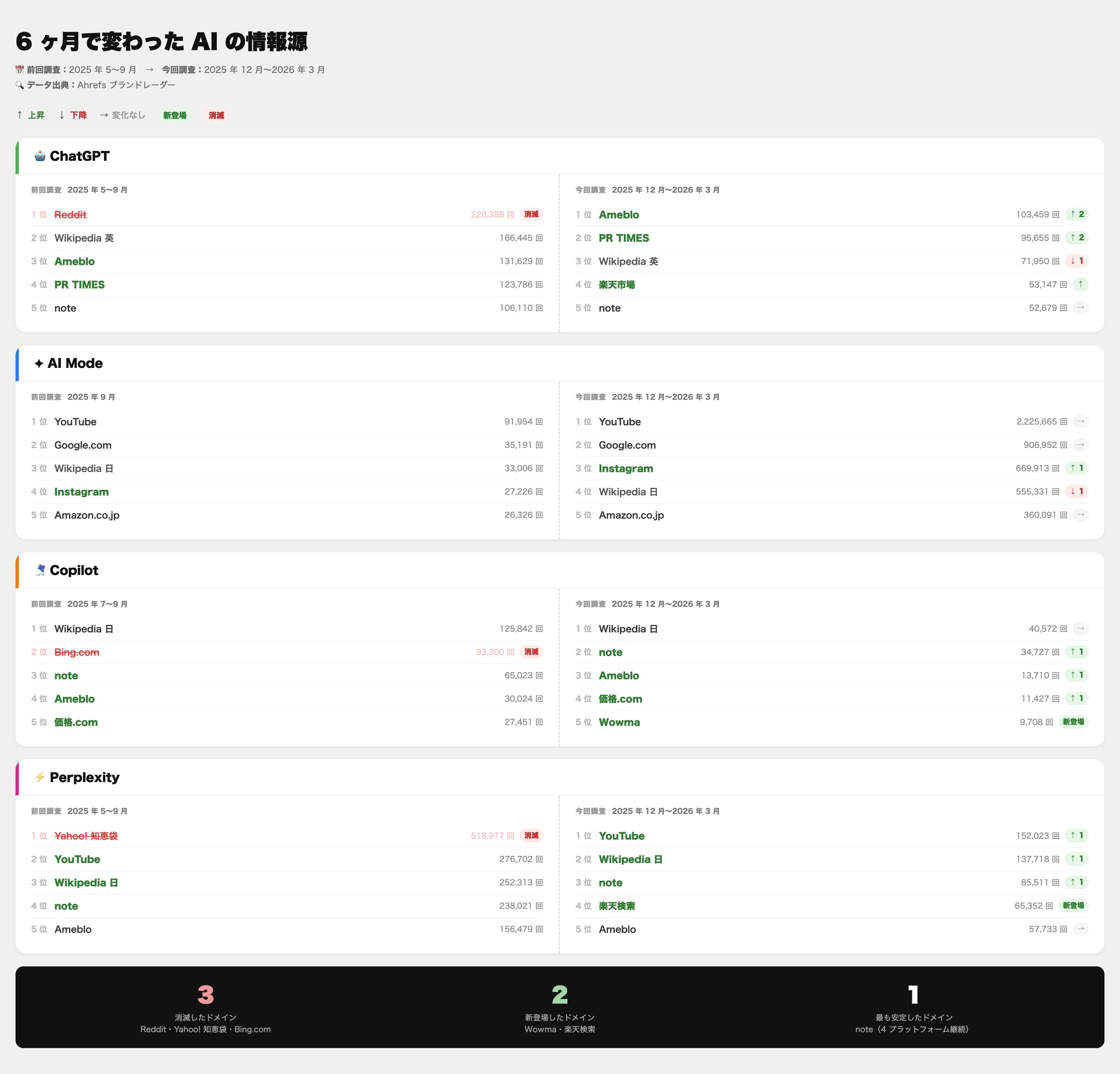 【Ahrefs 調査|6 ヶ月で変動した AI の情報源】ChatGPT・AI モード・AI による概要・Perplexity・Copilot が引用するドメイン最新ランキング