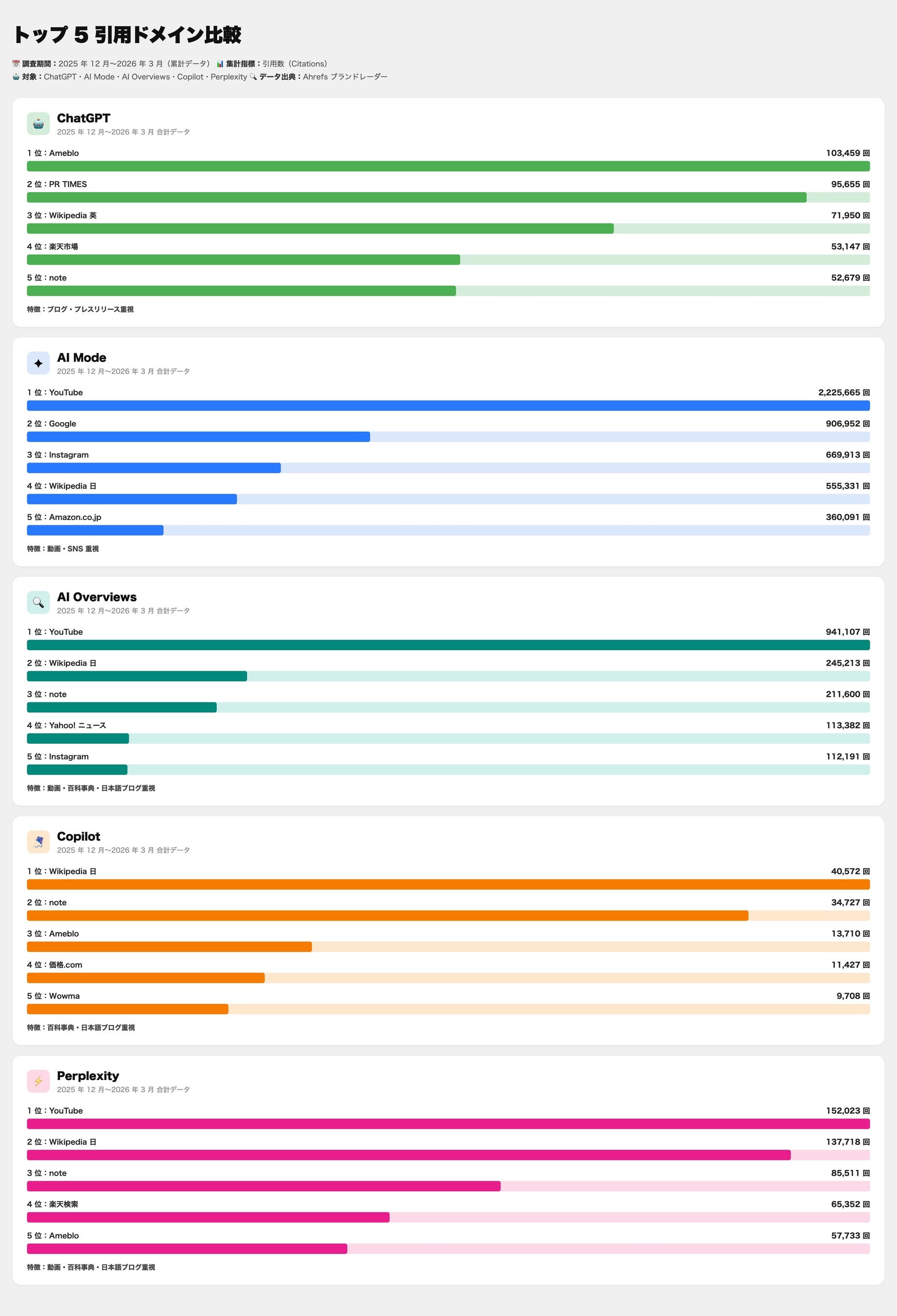 以下は、5 つの AI プラットフォームの引用数を合算した総合ランキングです(2026 年 3 月 31 日時点の累計)。