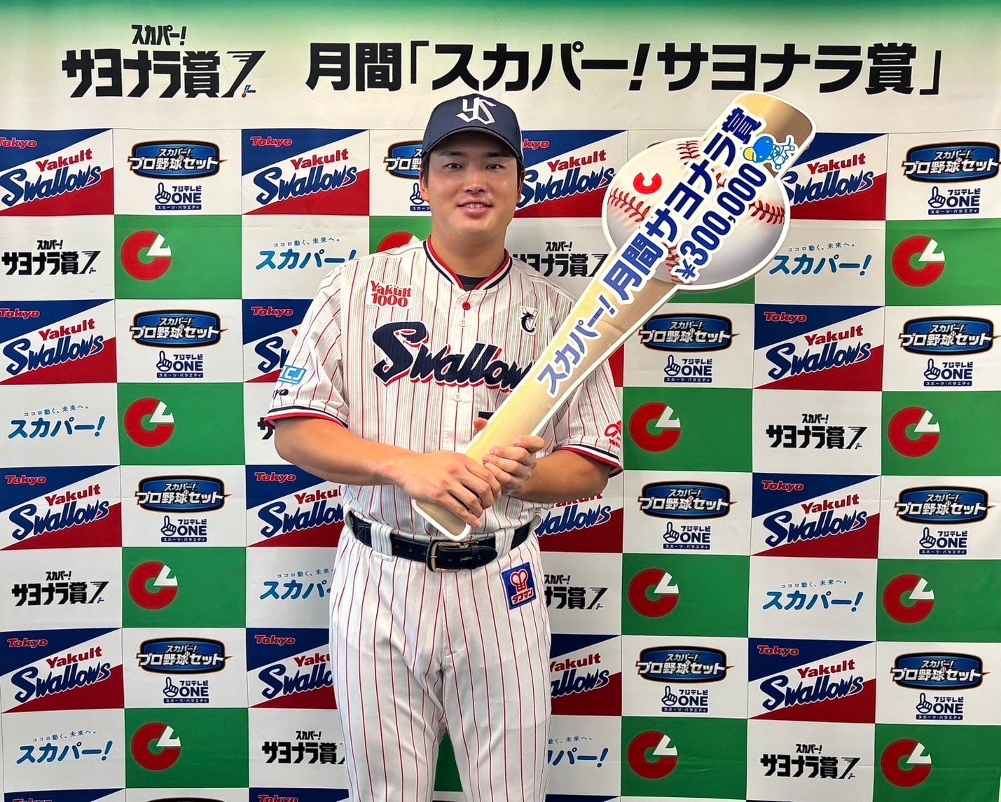 9月12日(金)、月間「スカパー! サヨナラ賞」8月度の受賞選手に、セ・リーグは村上宗隆選手(東京ヤクルトスワローズ)、パ・リーグは頓宮裕真選手(オリックス・バファローズ)が発表され、各会場で表彰式が行われました。