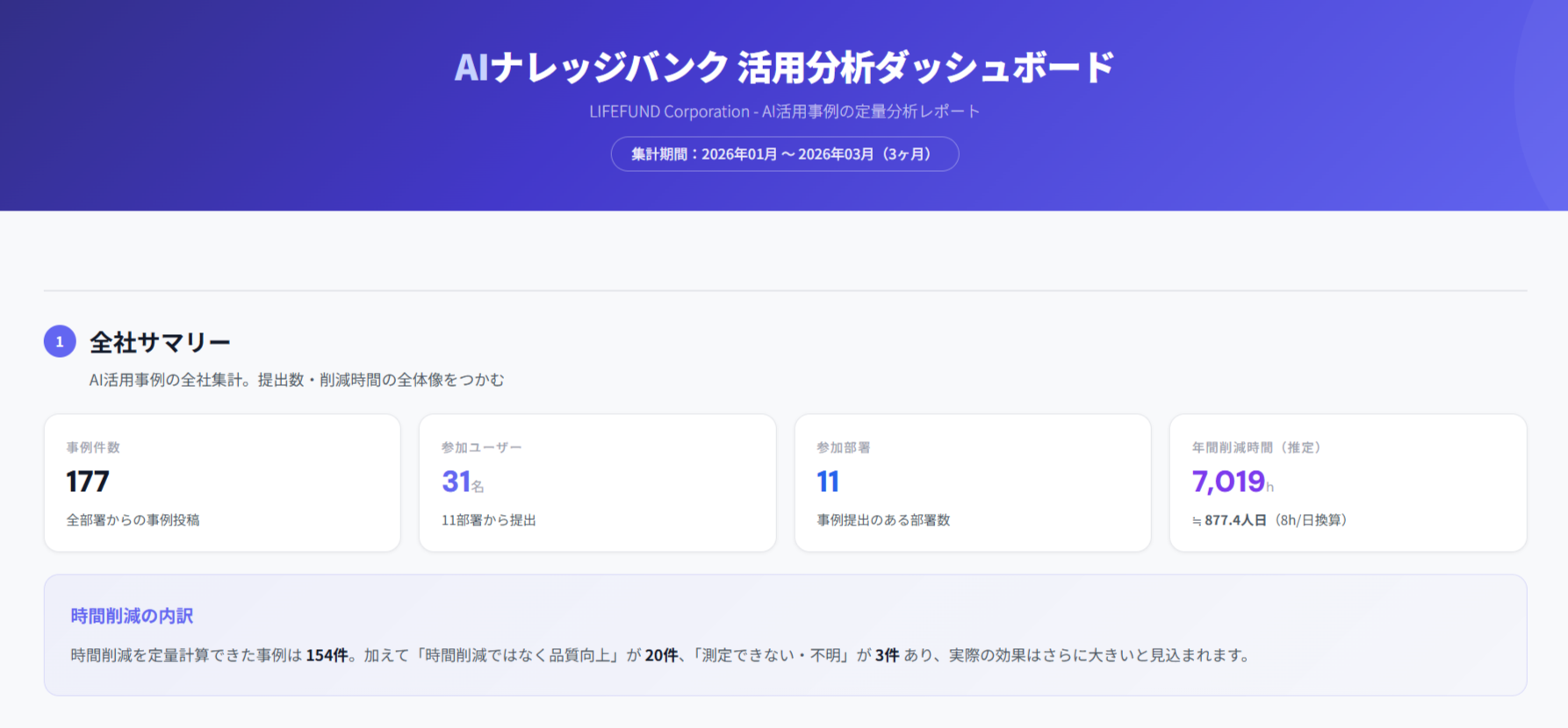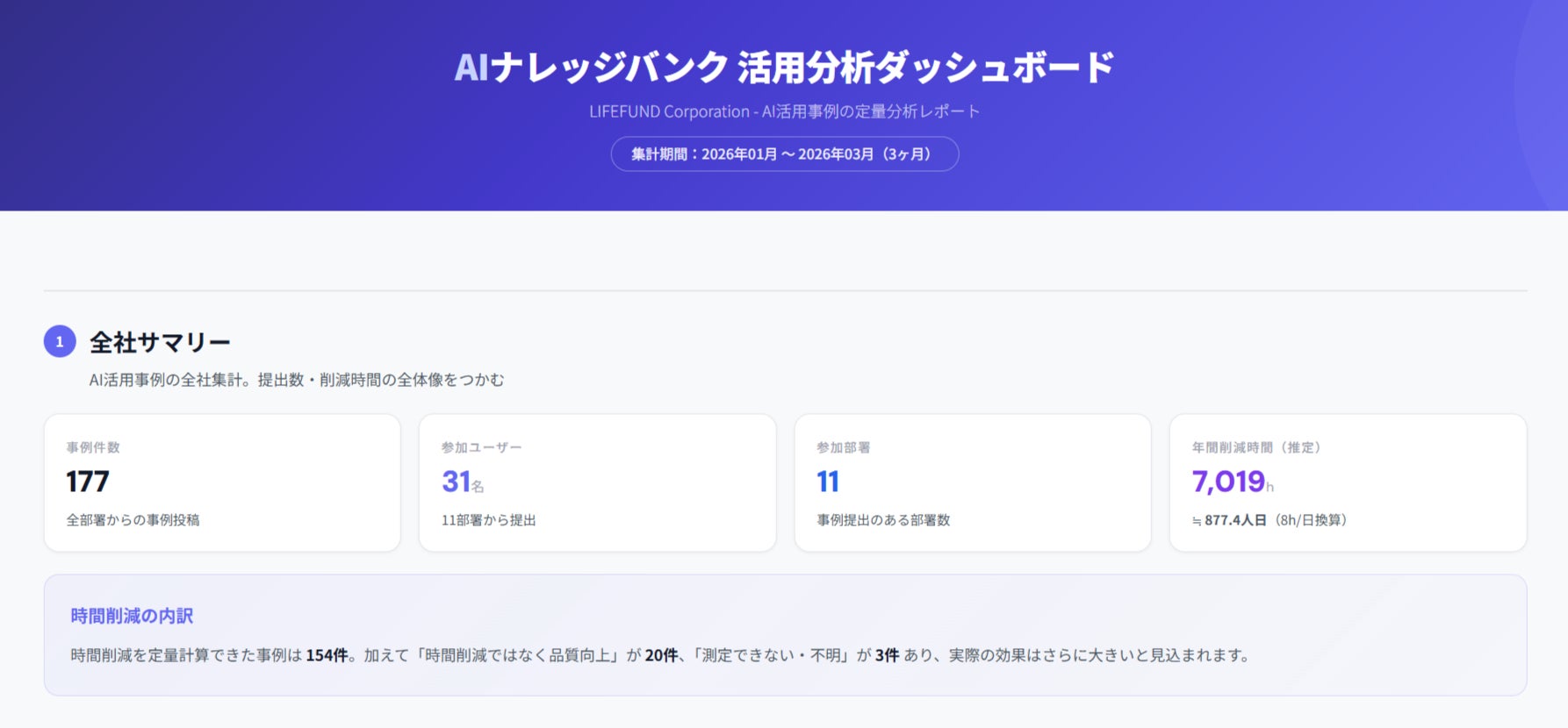 株式会社LIFEFUND(本社:静岡県浜松市、代表取締役:白都卓磨)は、2026年1〜3月の3ヶ月間に実施したAI活用推進の定量データを公開します。