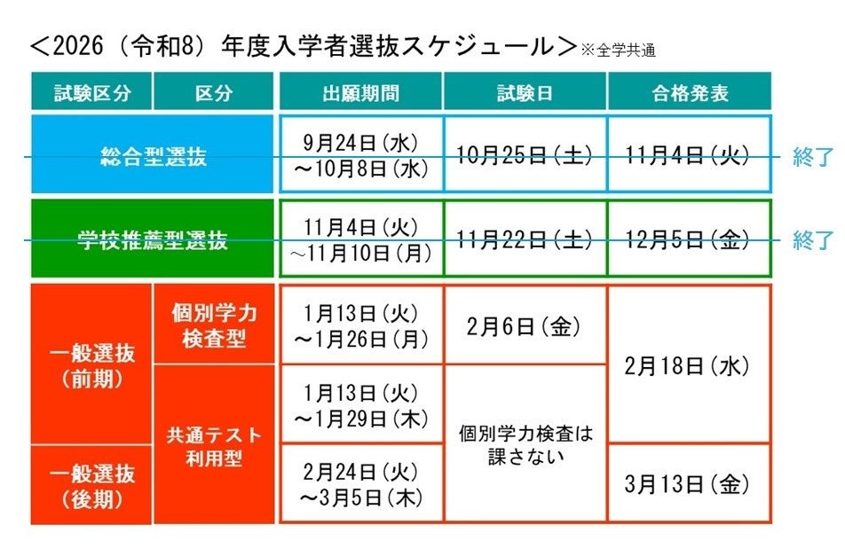 2026年度入学者選抜では、総合型選抜、学校推薦型選抜は終了しましたが、一般選抜を以下の日程で実施します。