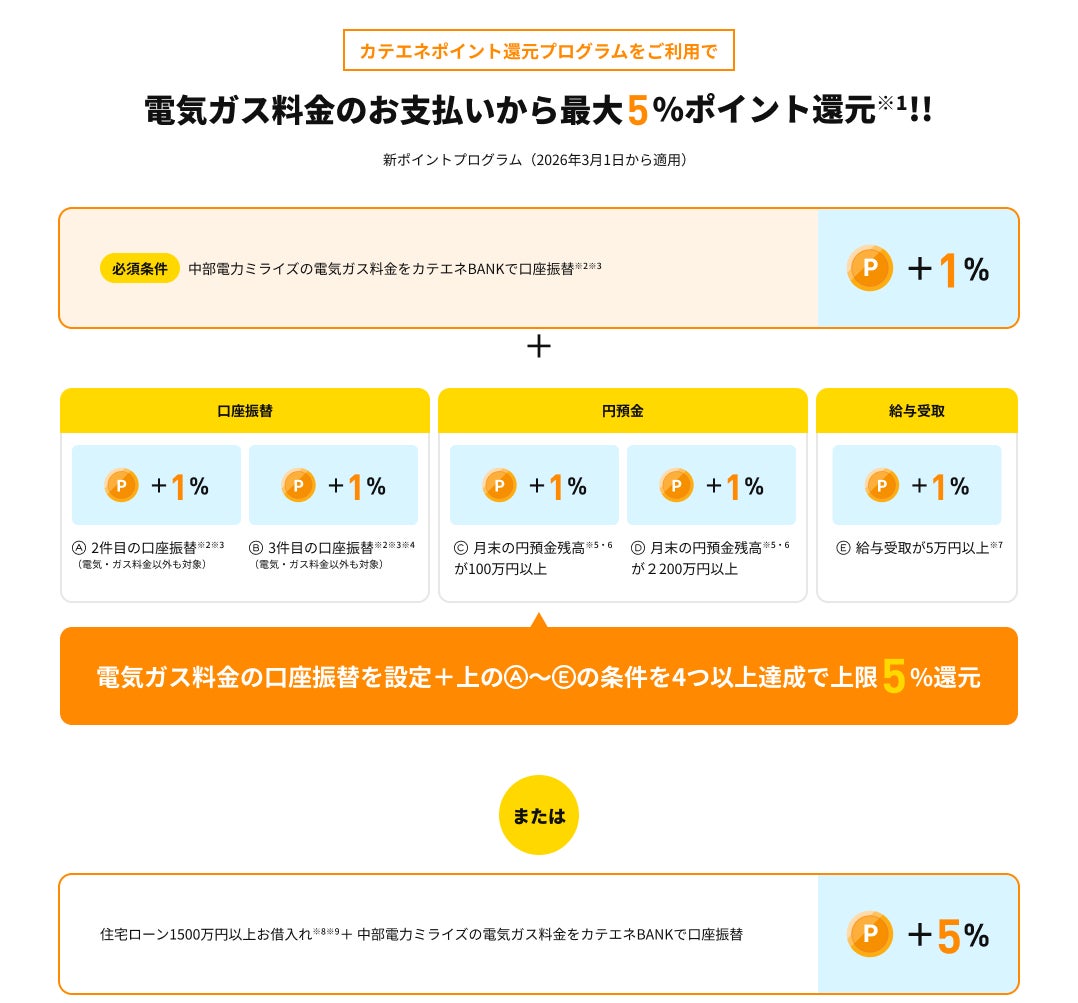 カテエネBANKでは、銀行サービスの利用状況に応じ、毎月、中部電力ミライズの電気・ガス料金のお支払い額の最大5%がカテエネポイントで還元されます。このたび、新たに預金と給与受取の条件を追加いたします。現行のプログラムにおけるデビットカードの利用条件は廃止となりますが、2026年1月1日よりデビットカードはご利用額に対して最大2%のカテエネポイントを進呈いたします。(②参照)