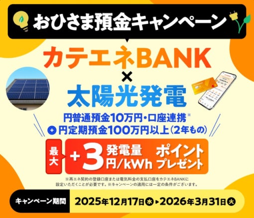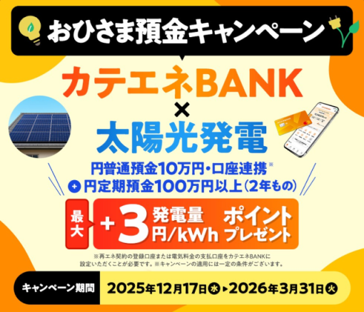 ・固定買取期間満了後、当社と電気受給契約(以下、「再エネ契約」)を締結し、カテエネBANKの口座を開設の上、以下の条件を達成したお客さまにカテエネポイントを進呈いたします。 条件① ・2026年3月末時点でカテエネBANKの口座に円普通預金10万円以上を預け入れ ・2026年3月末時点で再エネ契約と同一需要場所で当社と契約中の電気需給契約の口座振替をカテエネBANKに設定し、後述の条件確認日において当該口座振替設定が継続していること 特典① 1円/kWh × 算定期間の発電量 のカテエネポイント 条件② ・条件①を達成したうえで、申込期間中に新たにカテエネBANKで100万円以上の円定期預金(2年もの)をご契約いただき、後述の条件確認日において当該円定期預金契約が継続していること 特典② 3円/kWh × 算定期間の発電量 のカテエネポイント ※達成する条件に関わらず特典進呈ごとに20,000ポイント/回を上限とします。 ※条件①と②を両方達成した場合、特典は「3ポイント/kWh分」となります(1ポイント/kWh分と合算されません)。 ※再エネ特措法に基づく調達期間中の発電設備に関する再エネ契約は対象外です。 |
