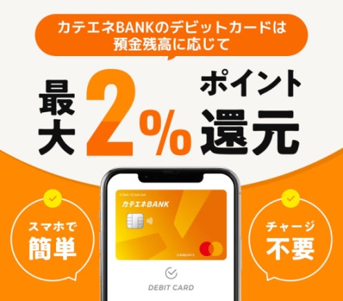 デビットカードの利用額に対して最大2%のカテエネポイントを進呈いたします。還元率は、デビットカード利用の前月末における円預金残高により決定いたします。詳細はこちらをご覧ください。