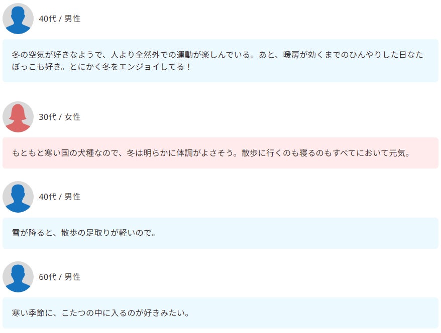 飼い主さんが「愛犬は冬が好き」と感じた主な理由は、「散歩や外遊びの様子が楽しそう」「寒くなると動きが軽くなり元気に見える」といった実感でした。