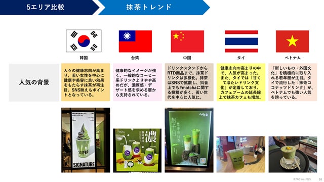 世界的に人気が拡大している抹茶。今回は韓国・台湾・中国・タイ・ベトナムの5エリアで、現地の抹茶事情をレポートしています。抹茶はブームを超えて定着、そして現地で独自の進化を遂げた進化系抹茶ドリンクも生まれています。