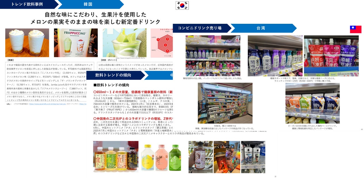 飲料を含めた食トレンドは、国ごとに独立して発生するのではなく、SNSや動画配信サイトにより“横に広がる”傾向が強まっています。欧米のトレンドが韓国に入り、韓国からアジア各国に広がるケースも多くあります。アジアの飲料トレンドを“横”でみることができる、レポートのコンテンツを紹介します。