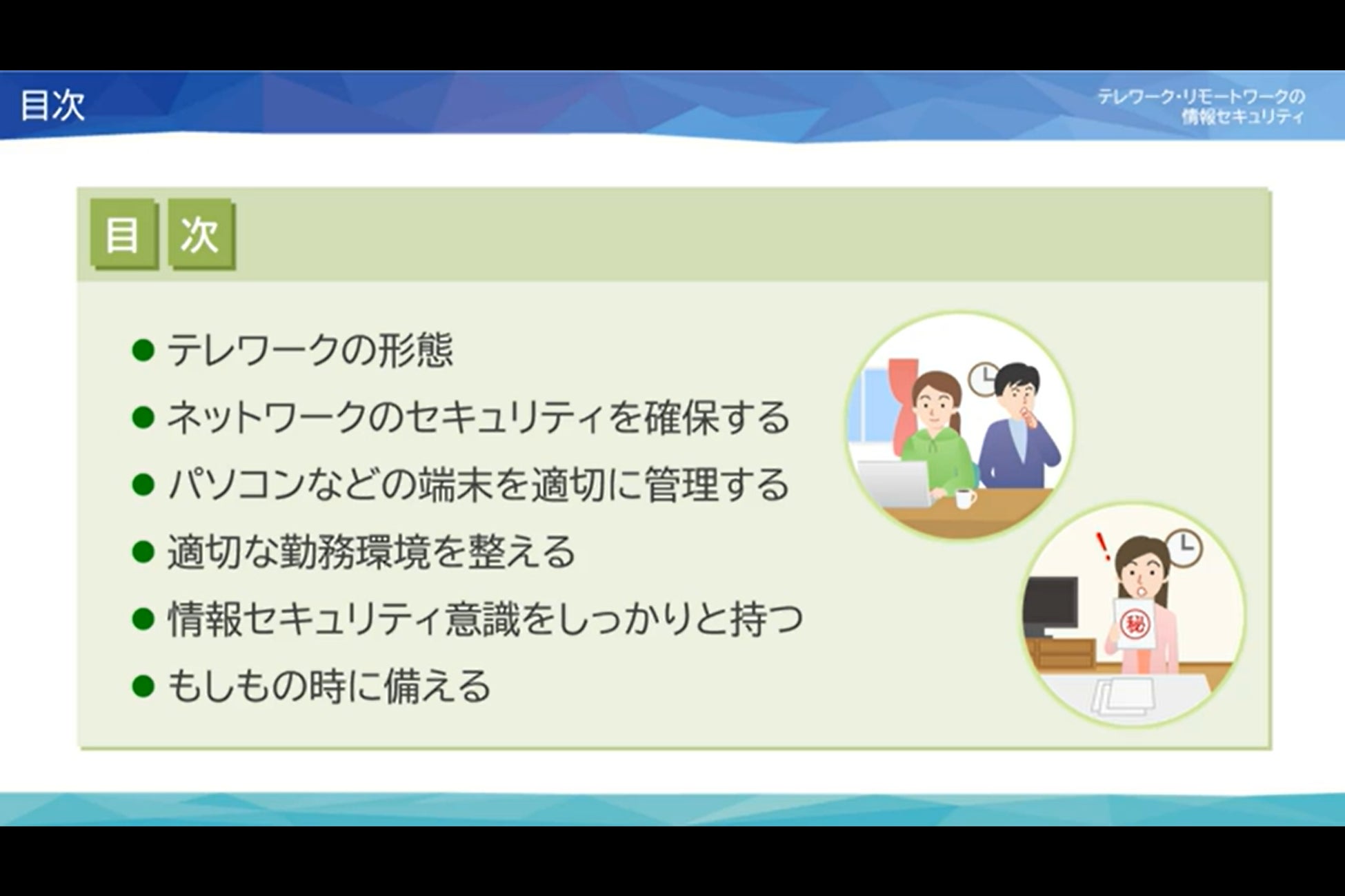 本コースでは、ネットワークや端末のセキュリティ管理、自宅での適切な勤務環境など、テレワーク・リモートワークを行う際の注意点を、具体的に分かりやすく紹介しています。