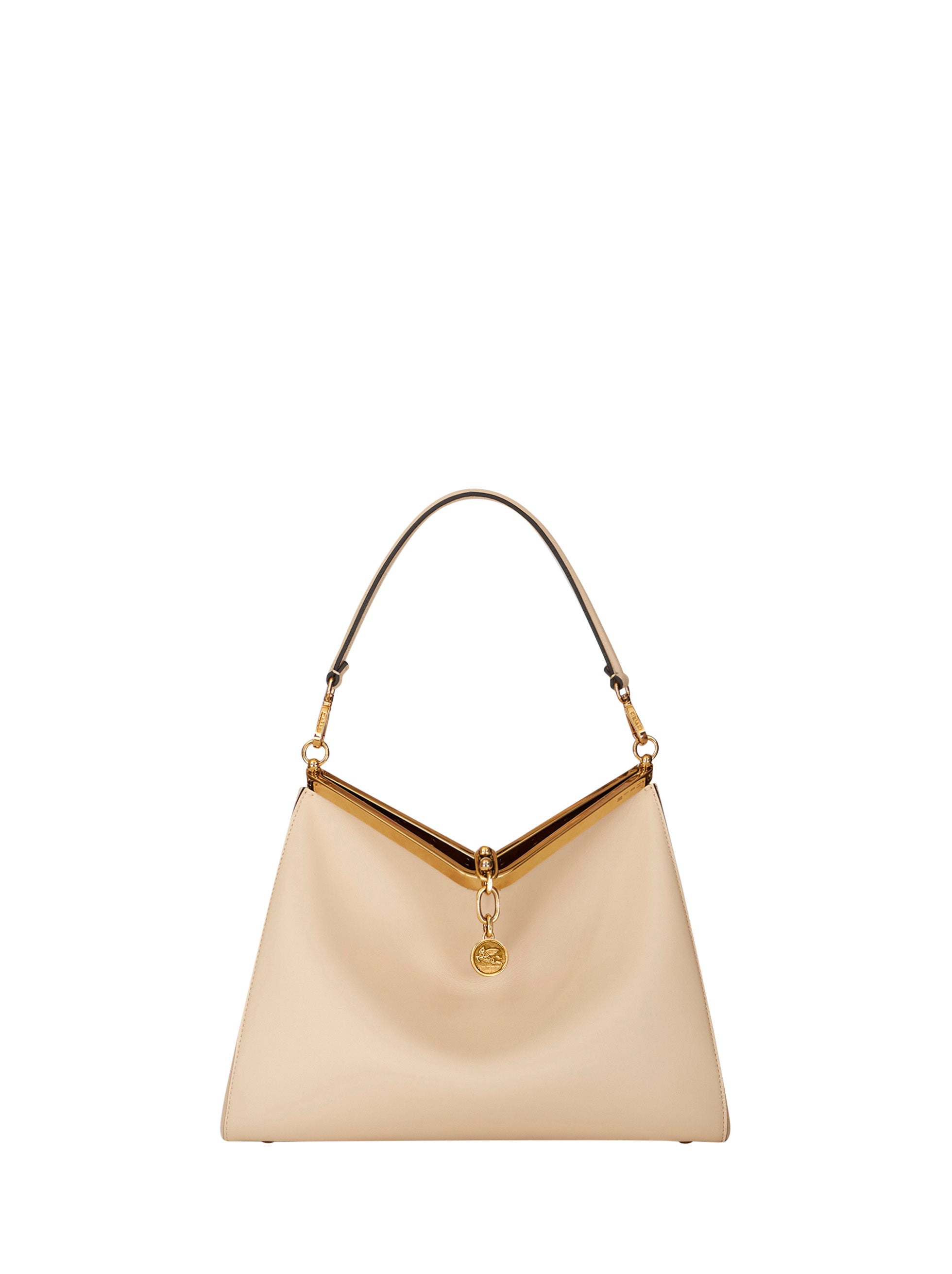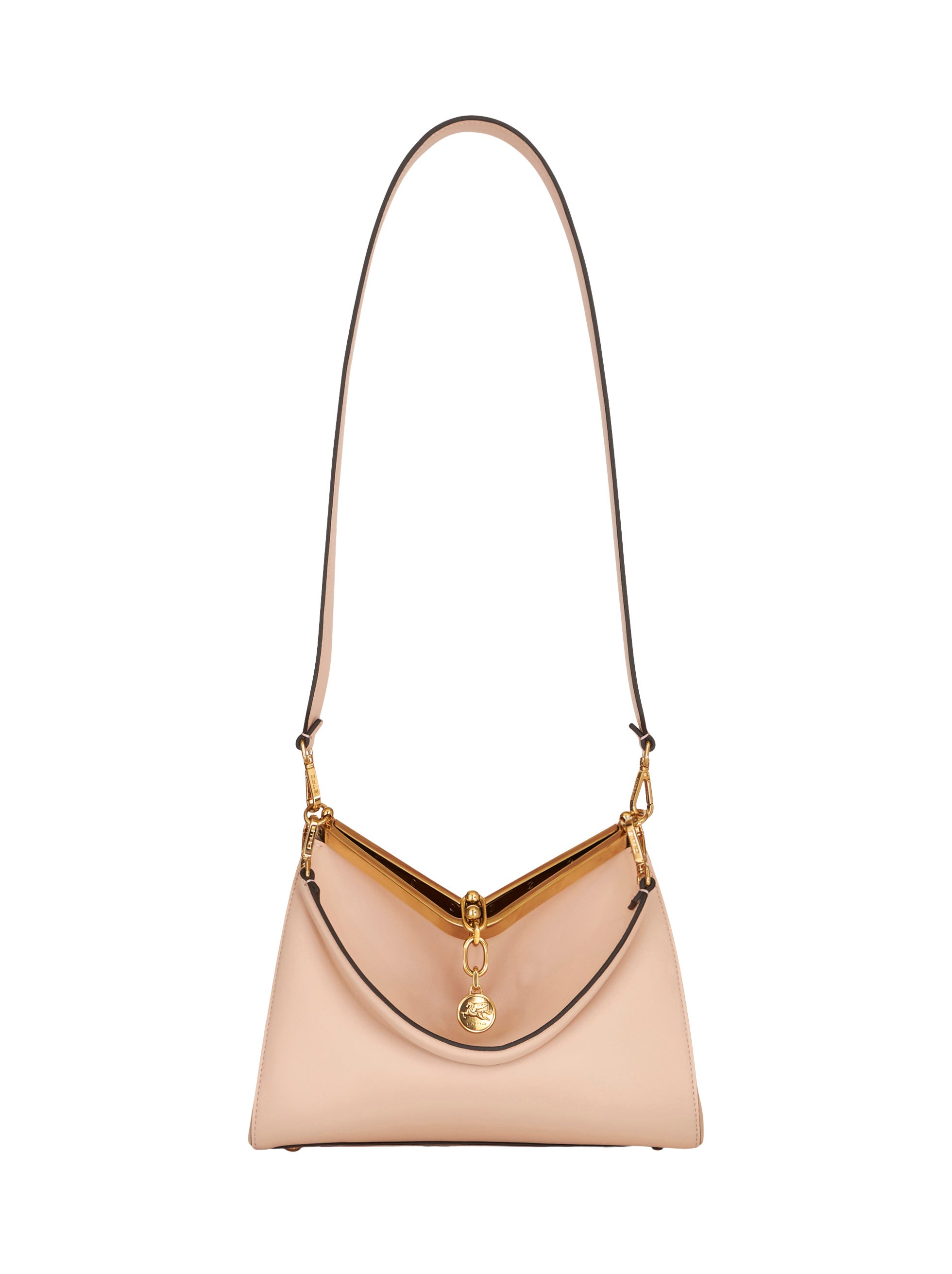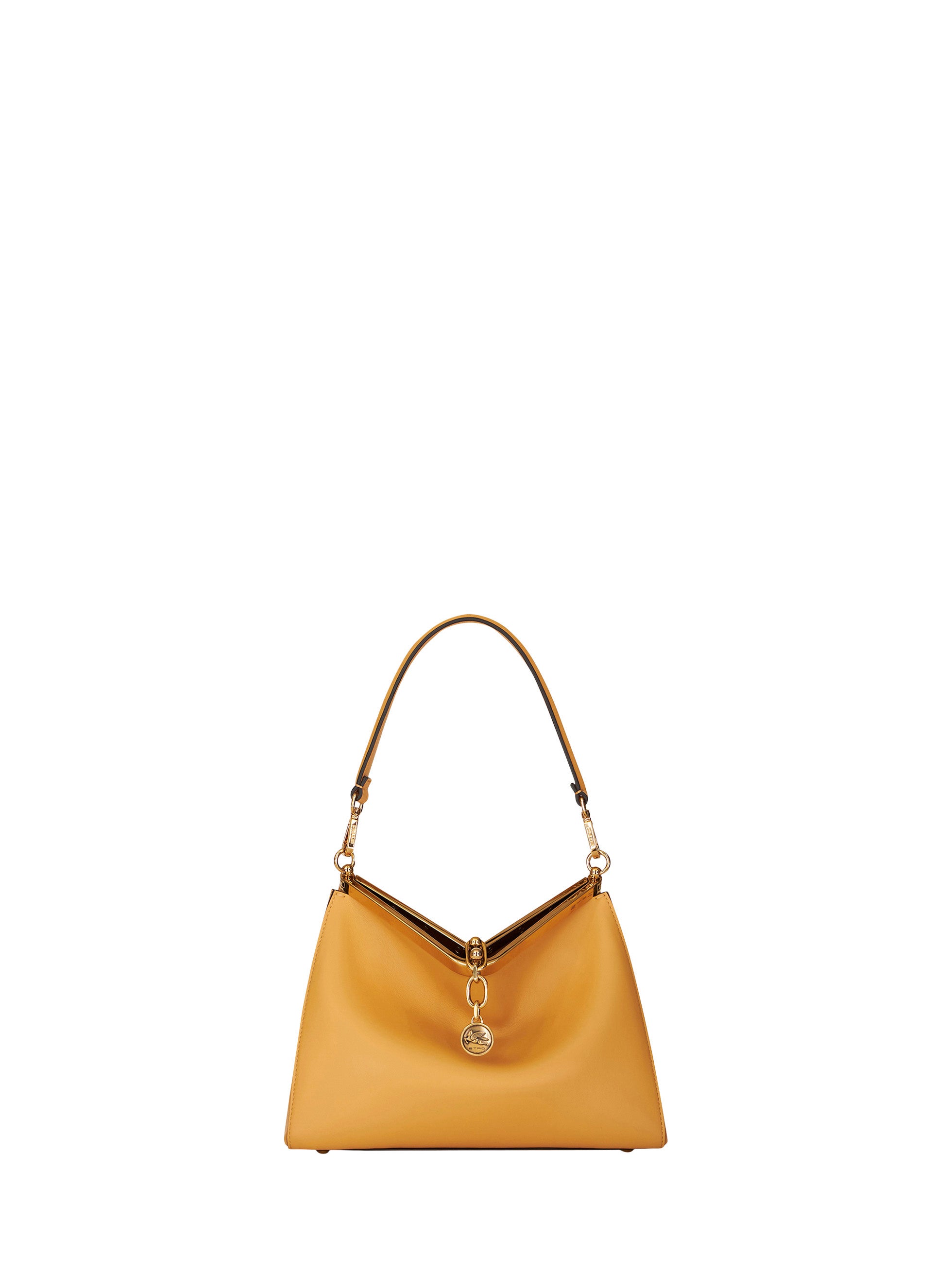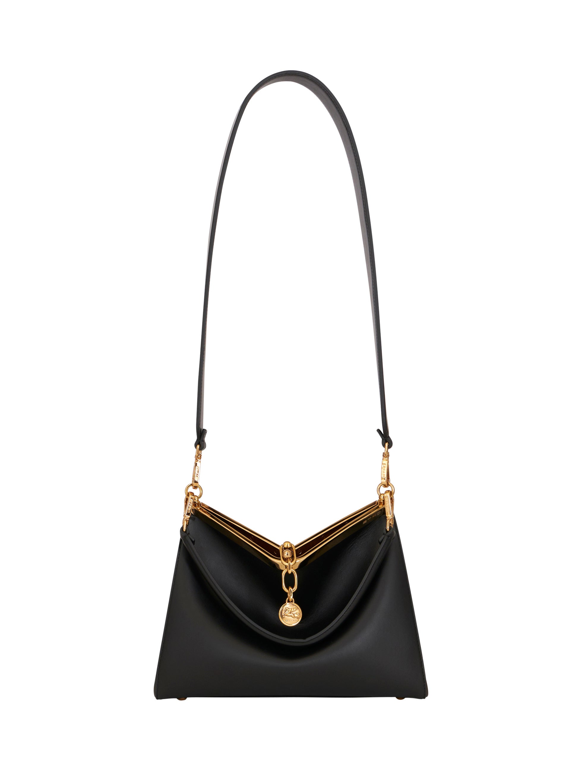 エトロのクラフツマンシップが光る「ヴェラ」は、美しいカーフスキンのボディに、双方向に開閉する斬新なV字型のメタルクロージャ―、メダル付のチェーンがあしらわれています。メダルの片面にはエトロのロゴ、もう片面にペガソが刻印されており、コイン鋳造と同じ技法で作られています。