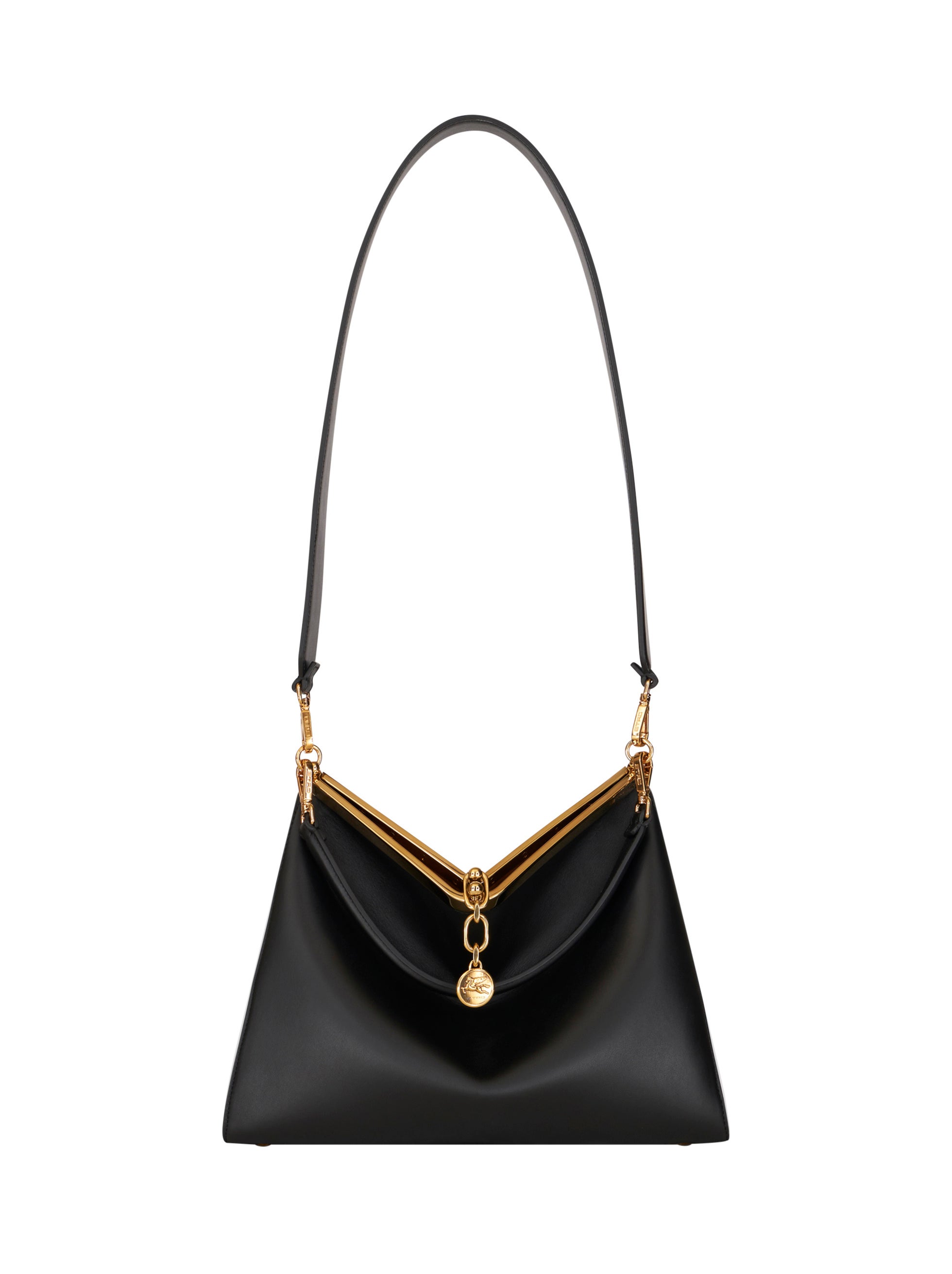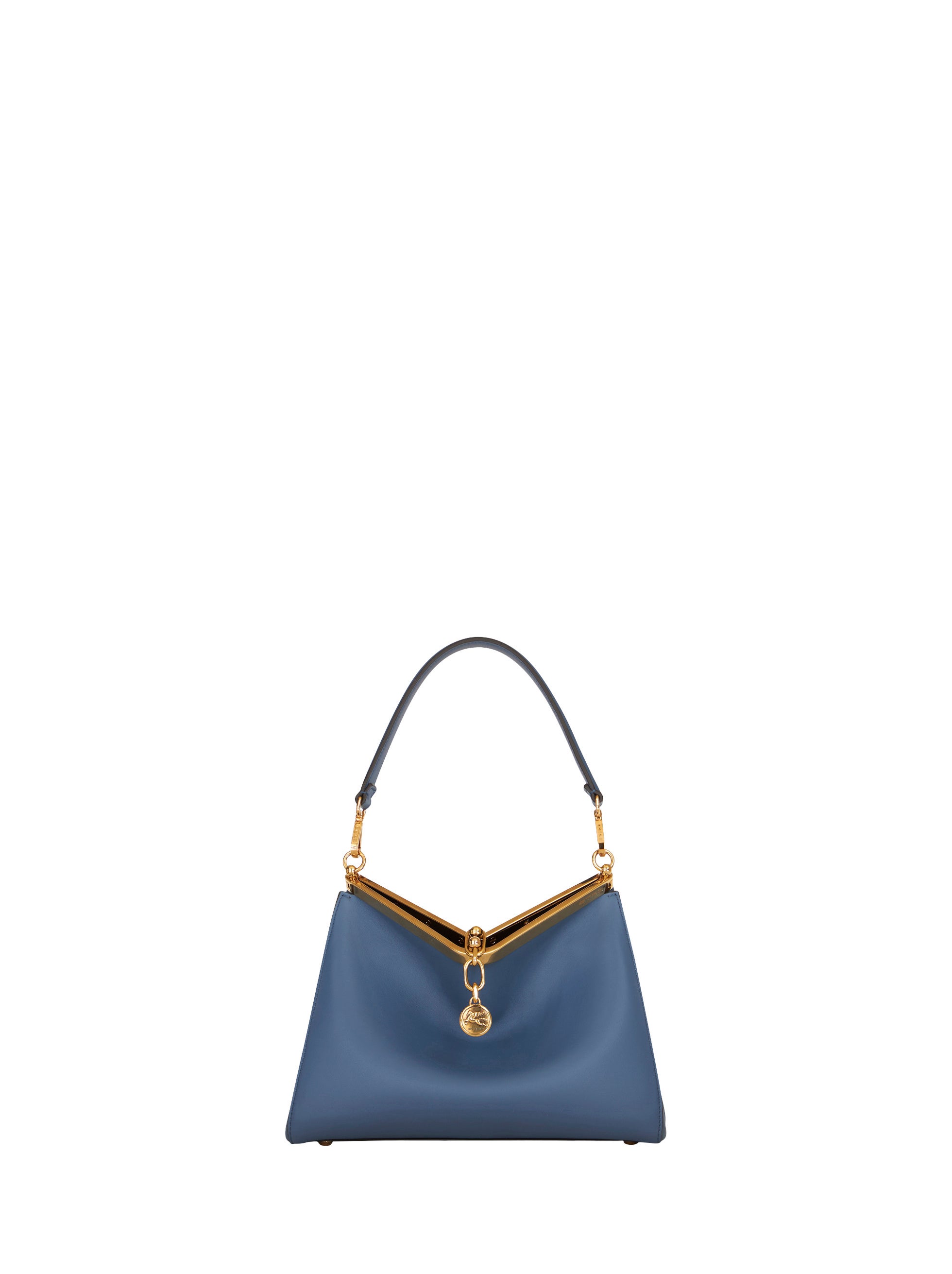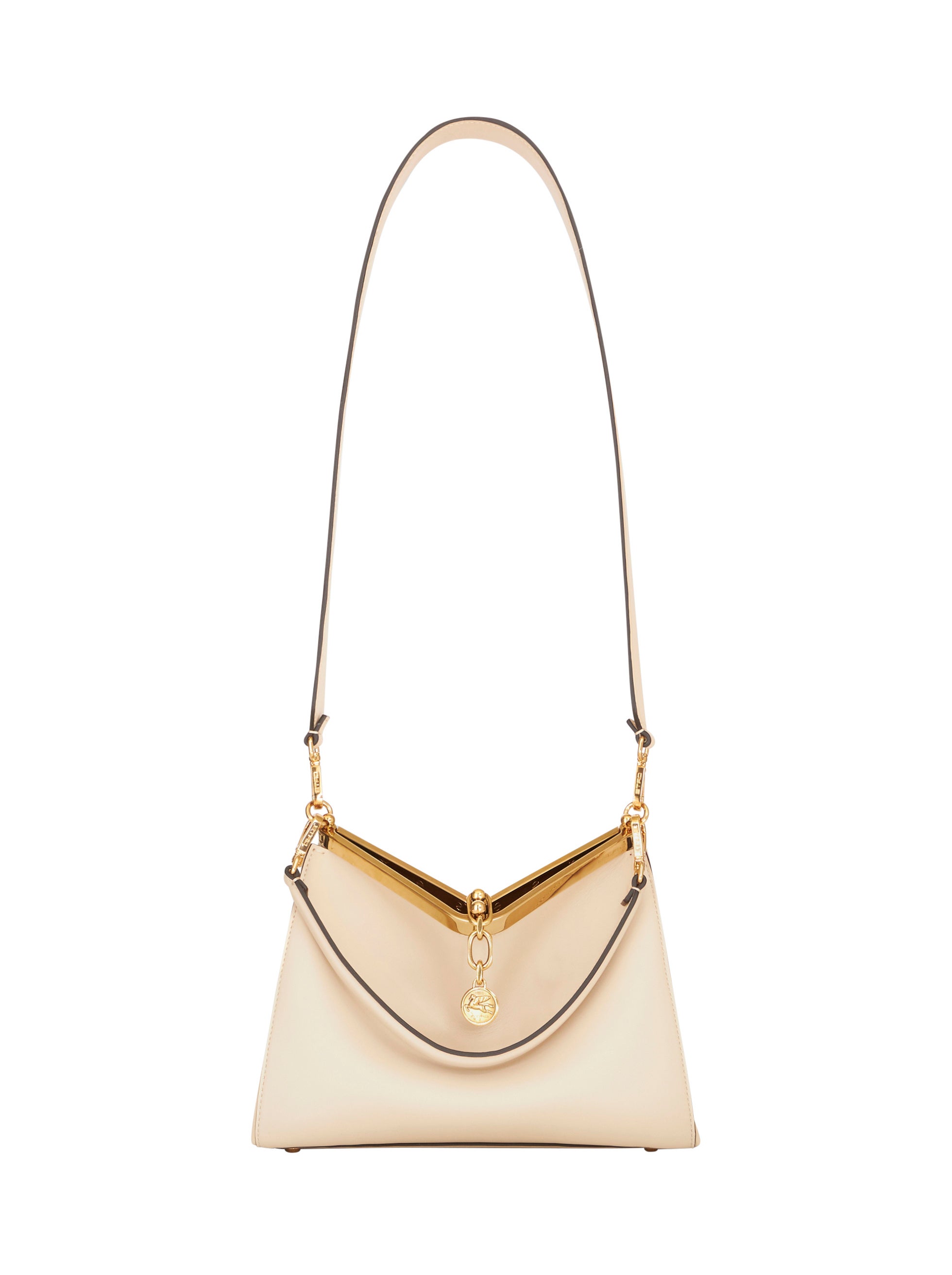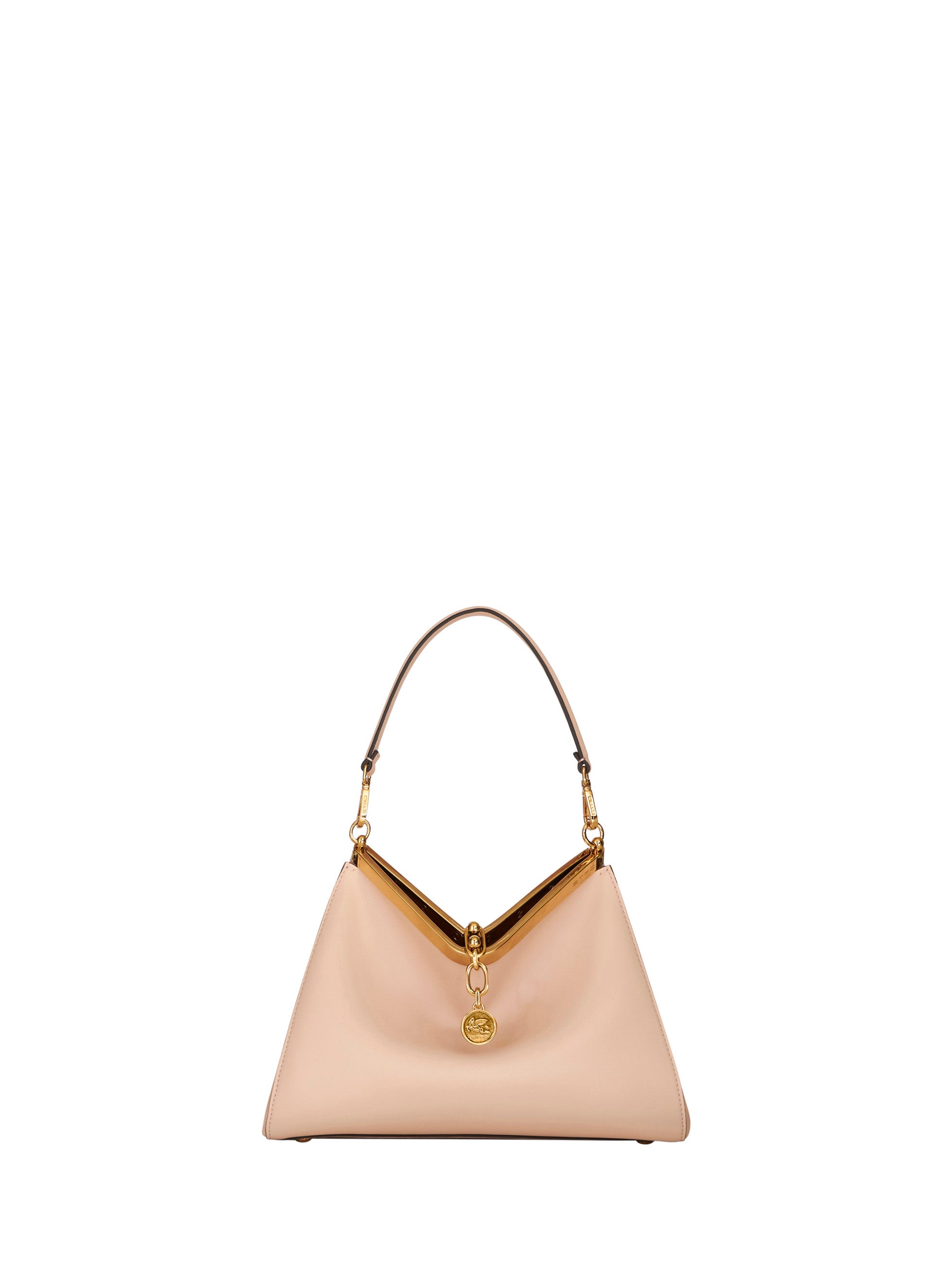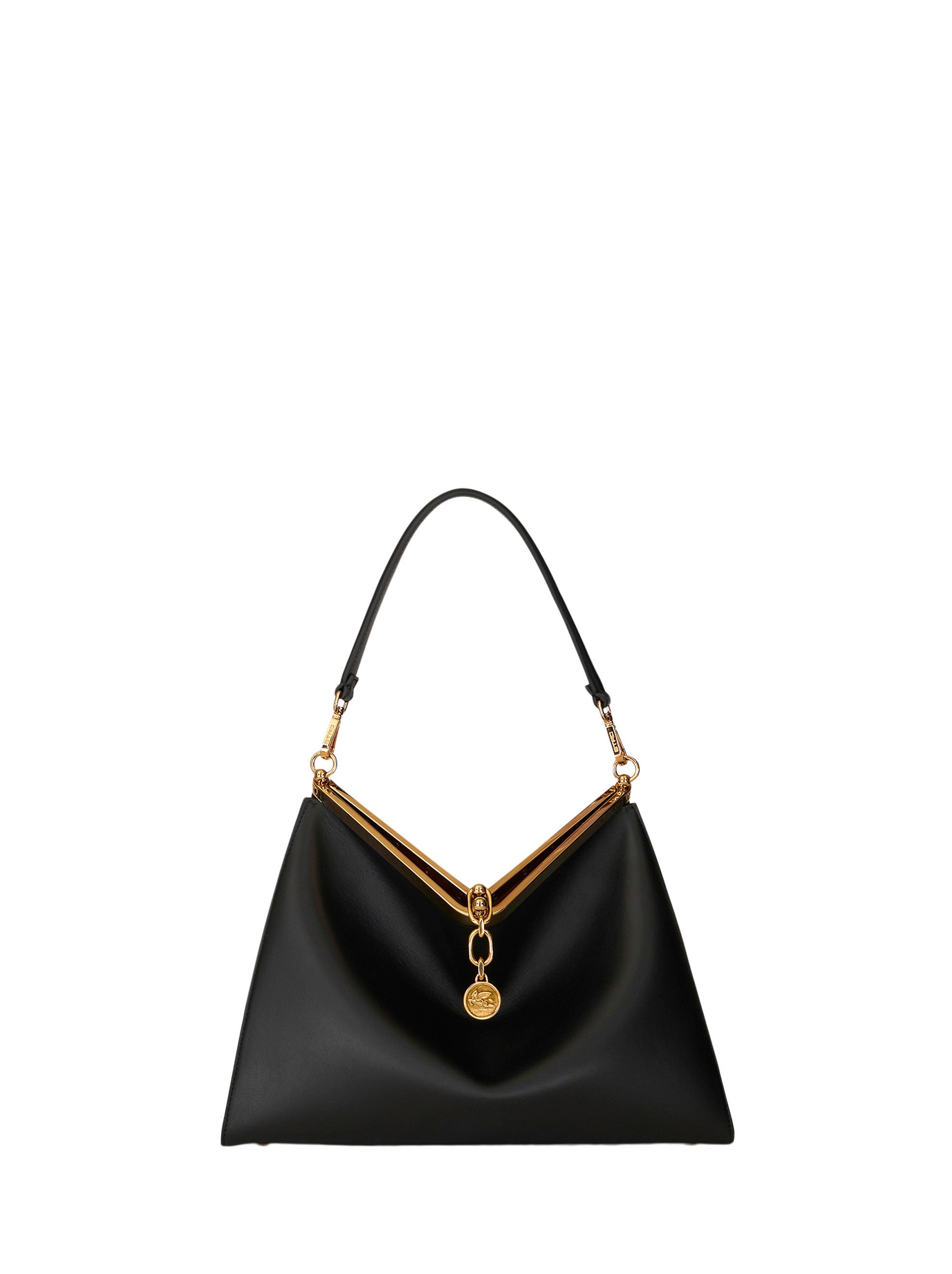 エトロのクラフツマンシップが光る「ヴェラ」は、美しいカーフスキンのボディに、双方向に開閉する斬新なV字型のメタルクロージャ―、メダル付のチェーンがあしらわれています。メダルの片面にはエトロのロゴ、もう片面にペガソが刻印されており、コイン鋳造と同じ技法で作られています。