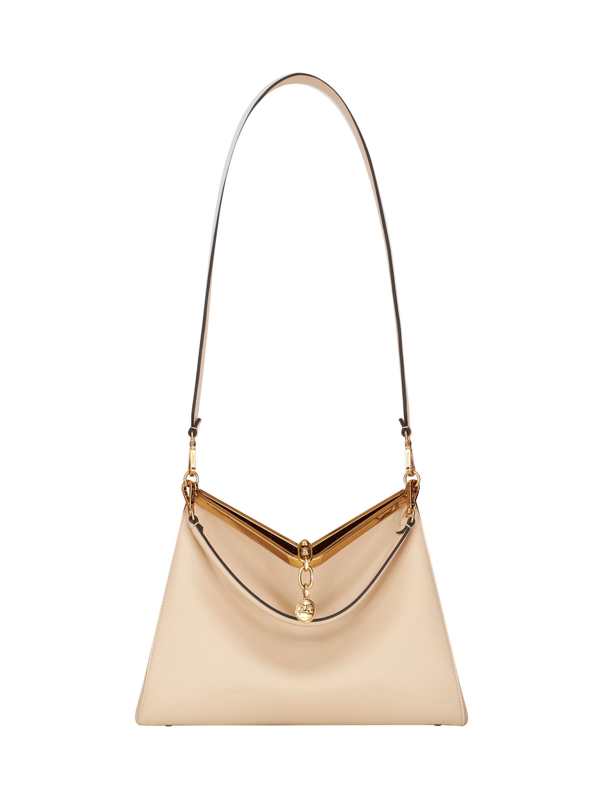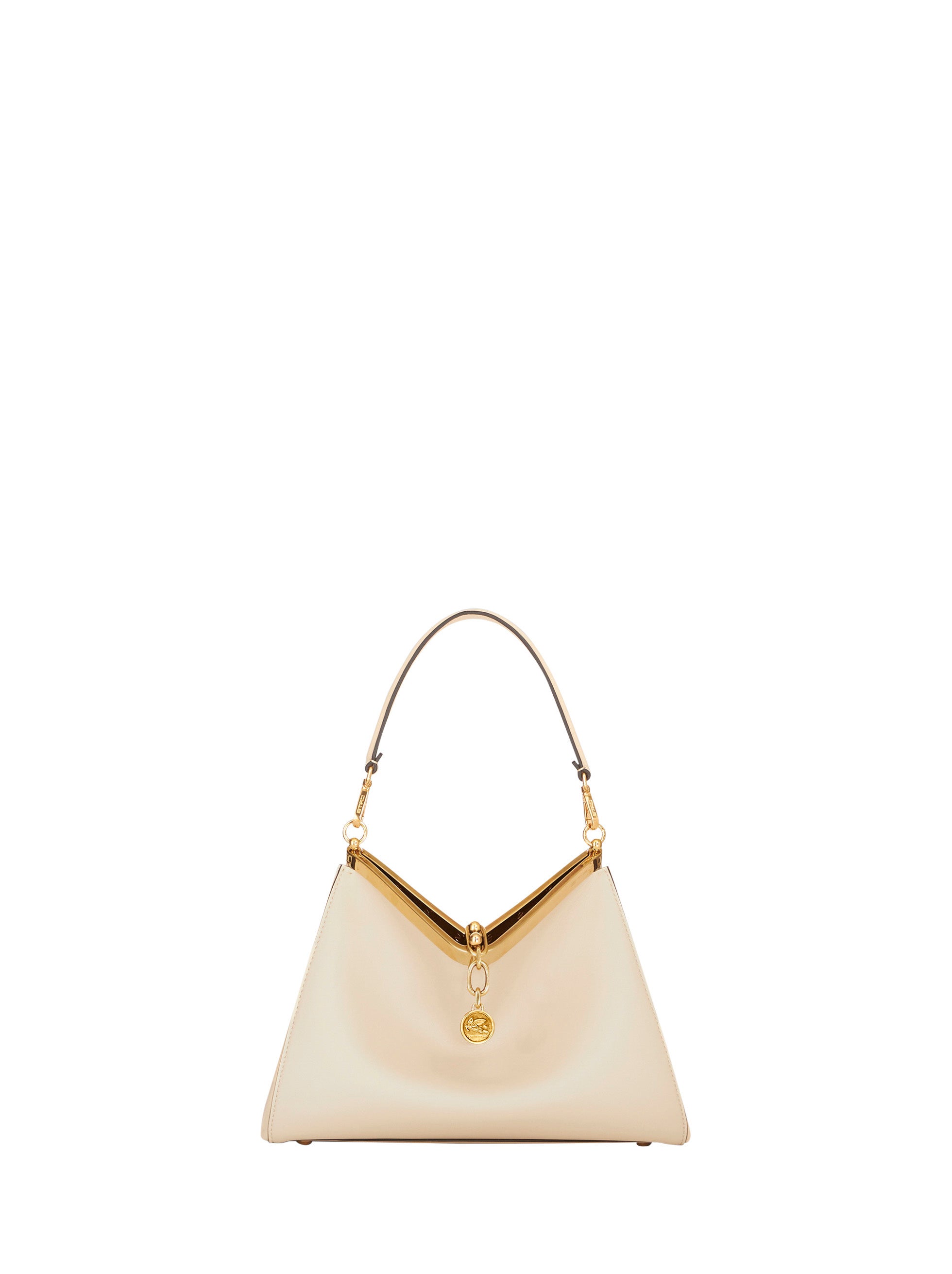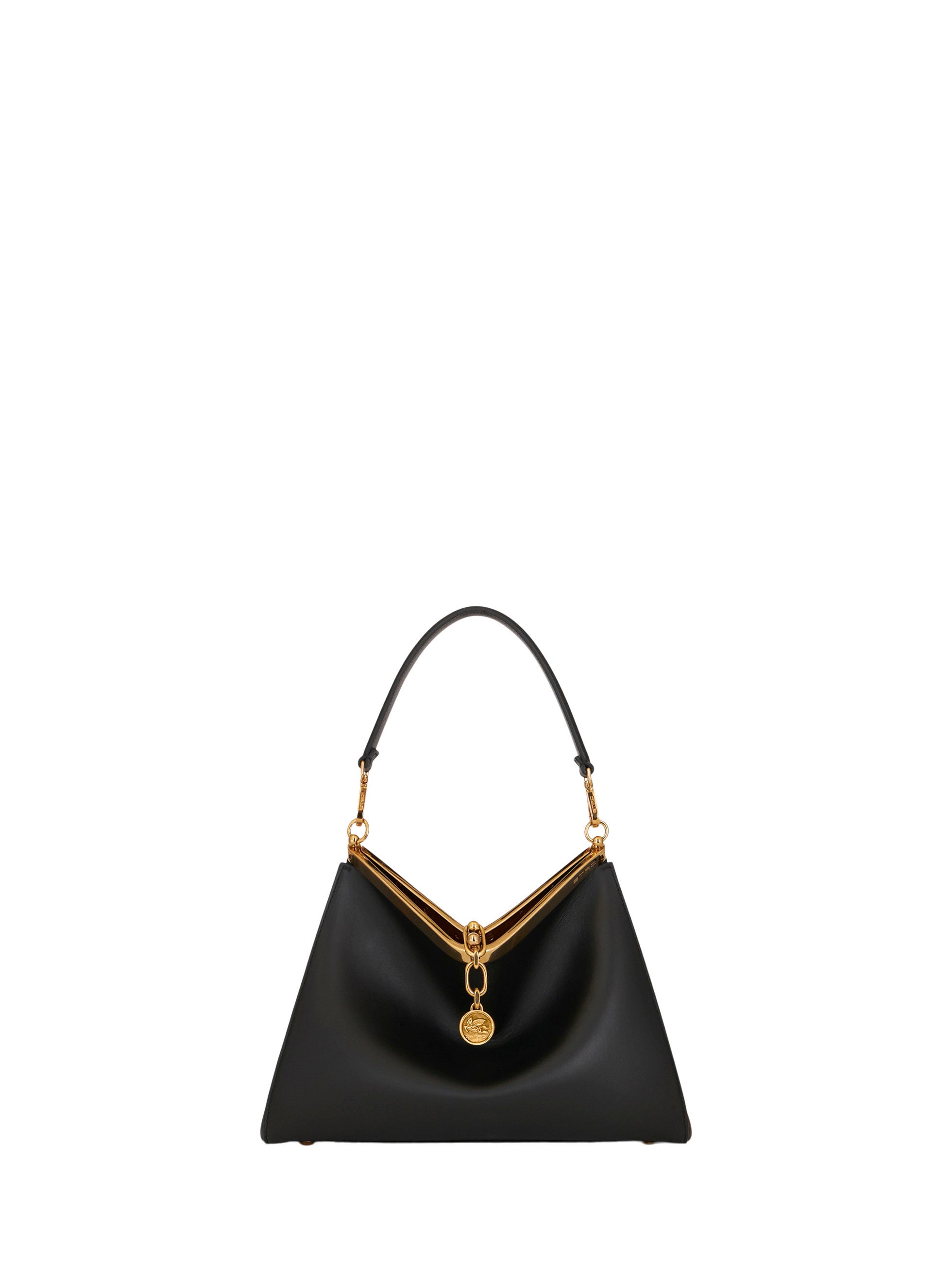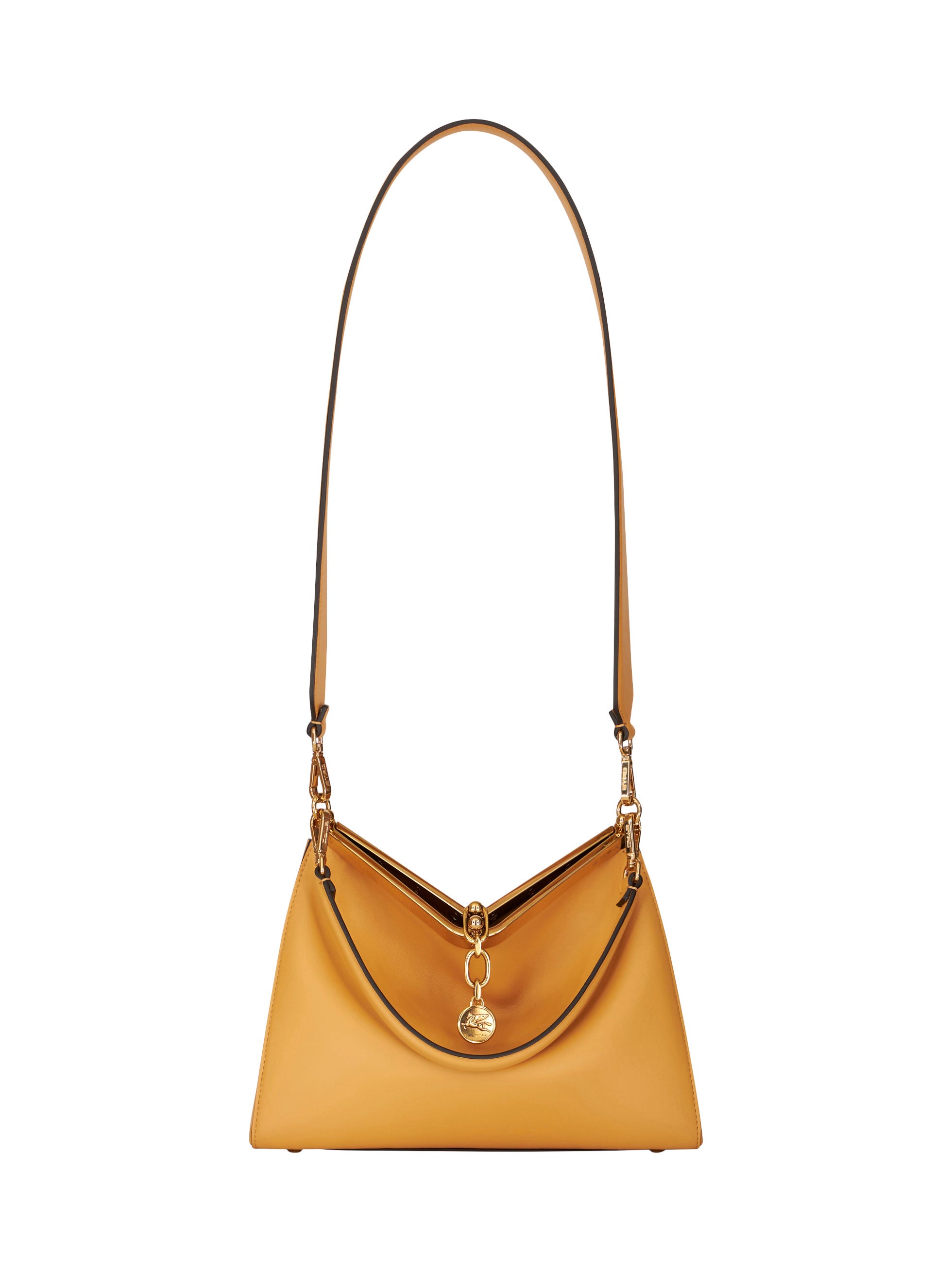 エトロのクラフツマンシップが光る「ヴェラ」は、美しいカーフスキンのボディに、双方向に開閉する斬新なV字型のメタルクロージャ―、メダル付のチェーンがあしらわれています。メダルの片面にはエトロのロゴ、もう片面にペガソが刻印されており、コイン鋳造と同じ技法で作られています。
