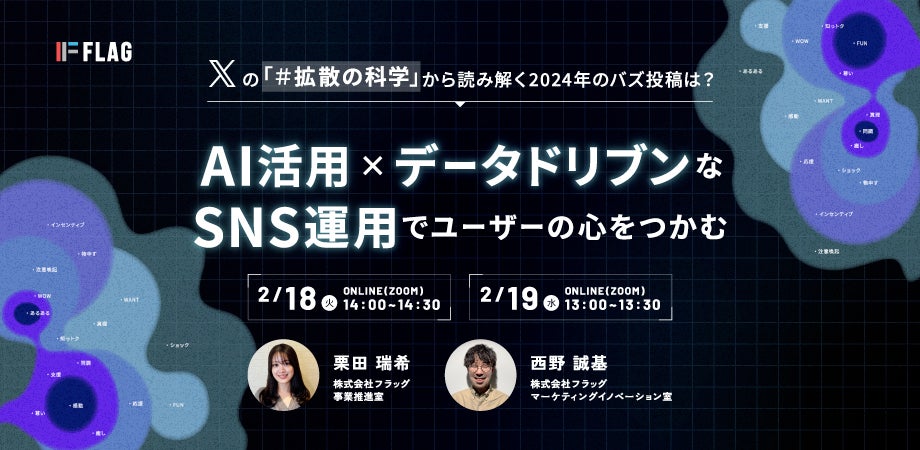 マーケティングコミュニケーションの総合プロデュースを担う株式会社フラッグ(本社:東京都渋谷区、代表取締役:久保浩章、以下、当社)は2025年2月18日(火)、19日(水)に、マーケティングにソーシャルメディアを活用している事業主・広告代理店様などを対象とした無料ウェビナーを開催いたします。